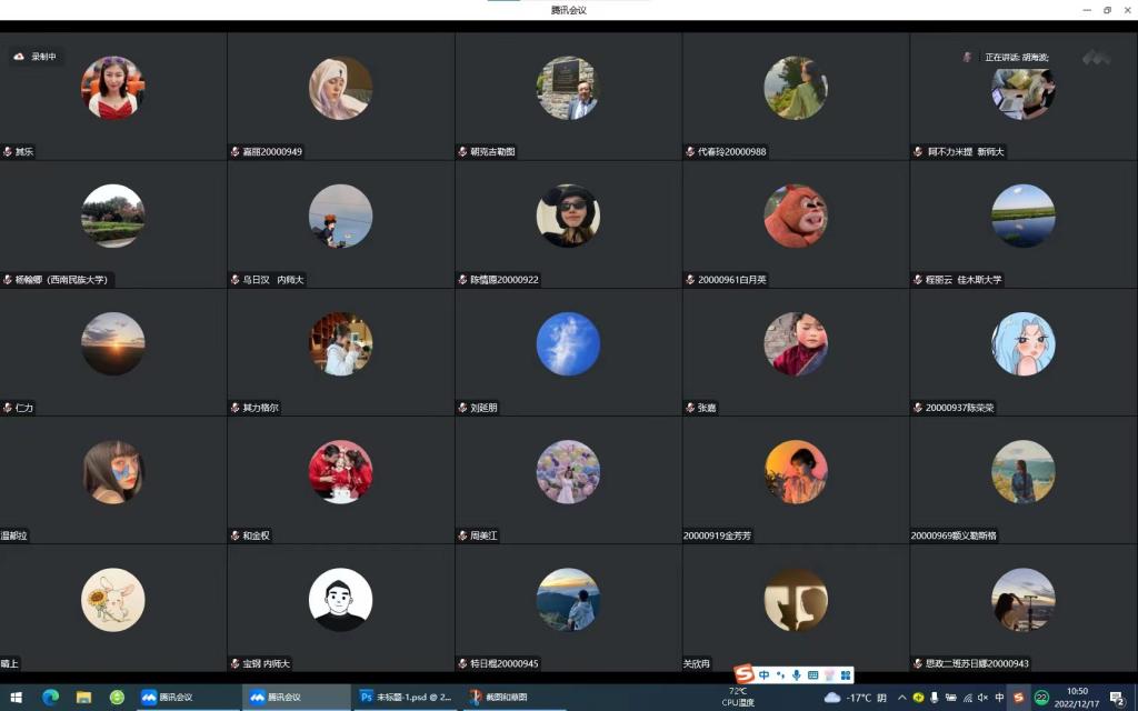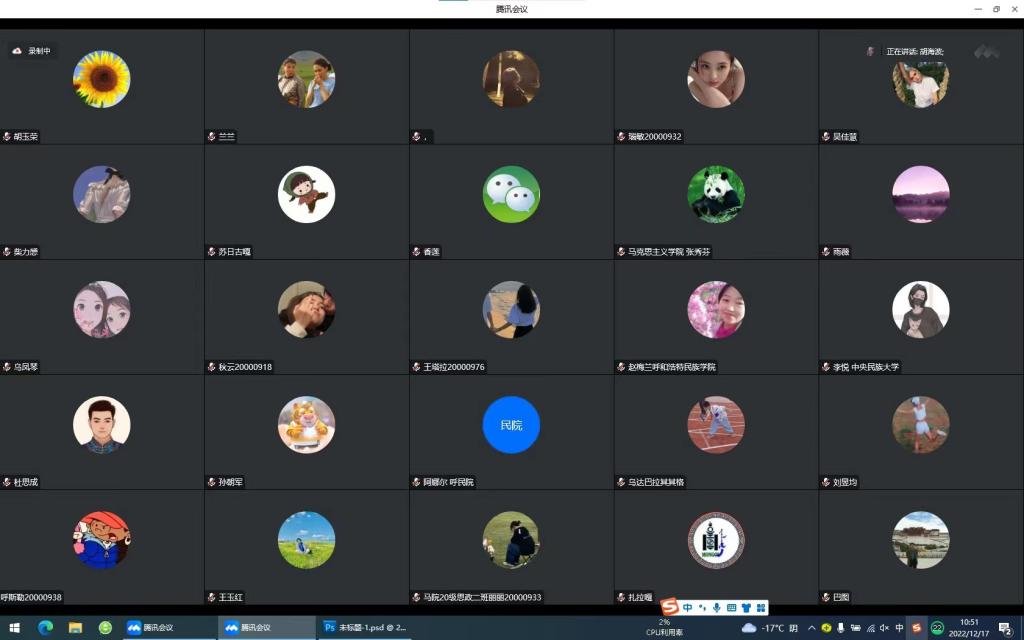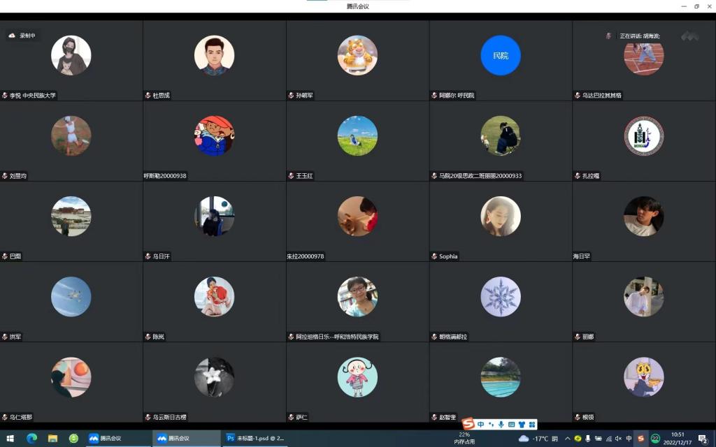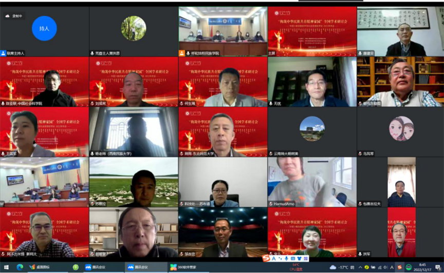 2022年12月17日至18日,由中國少數(shù)民族哲學及社會思想史學會主辦,呼和浩特民族學院馬克思主義學院、東北師范大學馬克思主義學部聯(lián)合承辦的“構(gòu)筑中華民族共有精神家園”全國學術(shù)研討會暨中國少數(shù)民族哲學及社會思想史學會2022年年會,以線上線下相結(jié)合的方式在我校隆重召開。來自中國社會科學院、中國人民大學、中央民族大學、東北師范大學等國內(nèi)18所高校及科研單位的百余名專家學者參會并開展了學術(shù)研討交流。校領(lǐng)導劉九萬、韓偉新、胡春梅出席線下會議。全體馬克思主義學院教師線上參會。
