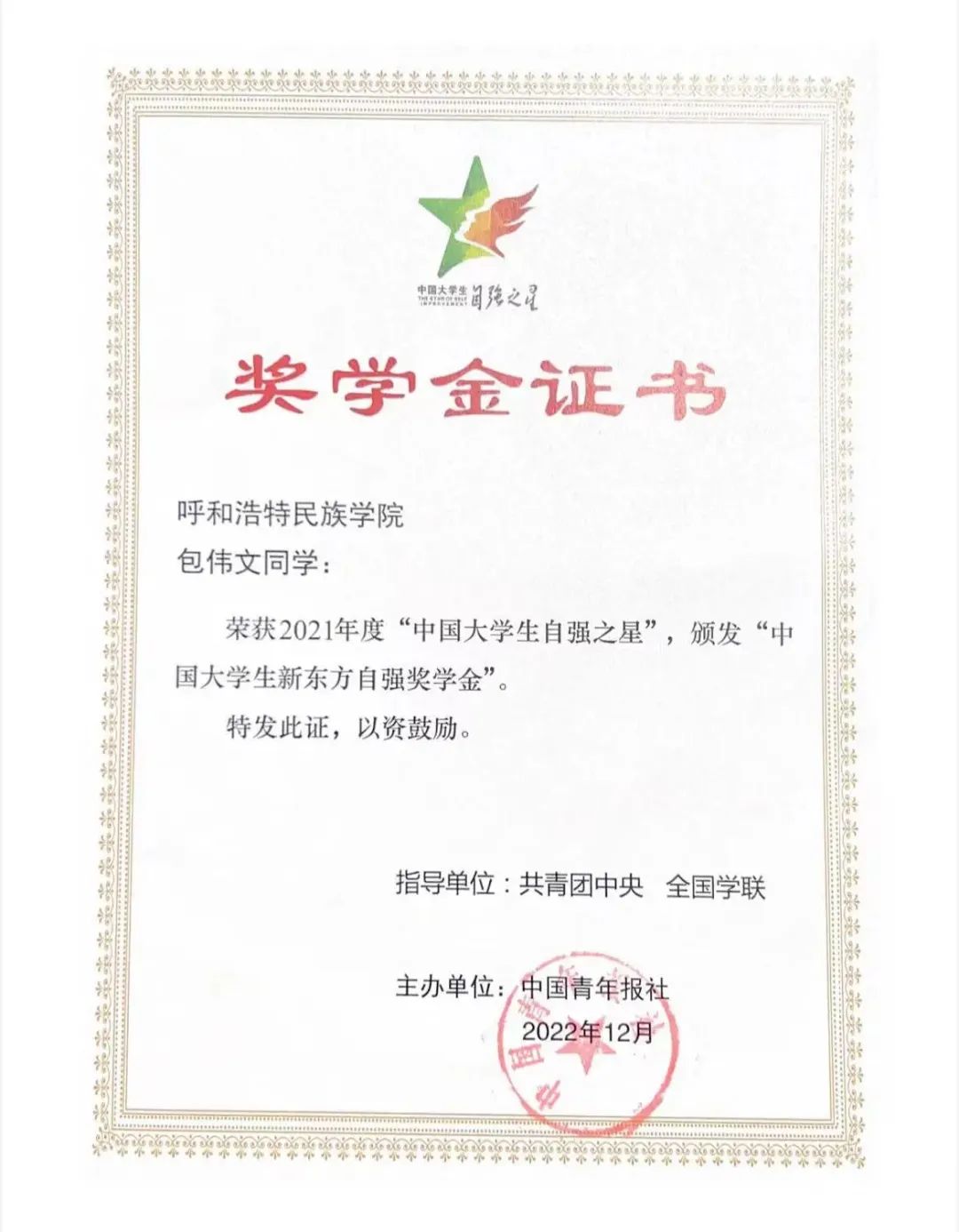 近日,由共青團中央、全國學聯指導,中國青年報社、新東方教育科技集團、中國青年創業就業基金會聯合舉辦的2021年度“中國大學生自強之星”尋訪活動結果揭曉,我校包偉文同學榮獲“中國大學生自強之星”稱號。