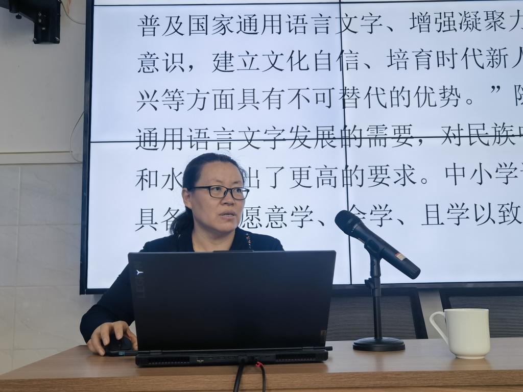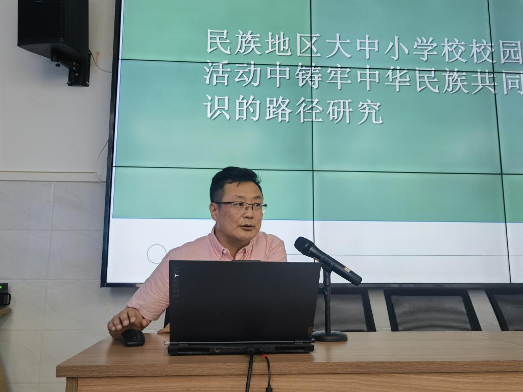 座談會上,胡春梅教授作了題為《教育教學研究方法與選題》的專題講座,就教育研究的原理方法、課題類型、課題來源、選題過程與方法、課題論證等內容作了深入闡釋,并鼓勵大家積極開展教育教學項目研究,探索新的教學模式和教育理念,推動中小學教育實現更高質量的發展。基礎教育學院院長崔鳳珍教授、外國語學院副院長紅鴿副教授、馬克思主義學院張秀芬副教授,基于中小課程教學改革的實際需要,分別結合語文、英語、道德與法治等課程教學作了題為《民族中小學語文閱讀教學研究》《同構思政課堂共育樹人篇章——關于大中小思政課一體化育人實施路徑的思考》《中小學英語課程改革與教師專業發展》的專題報告。發展規劃與學科建設處副處長哈達副教授從民族地區學校校園文化活動的豐富內涵入手作了題為《民族地區大中小學校校園文化活動中鑄牢中華民族共同體意識的路徑研究》,并提出了為民族地區學校如何將鑄牢中華民族共同體意識與校園文化活動高質量融合的相關建議。