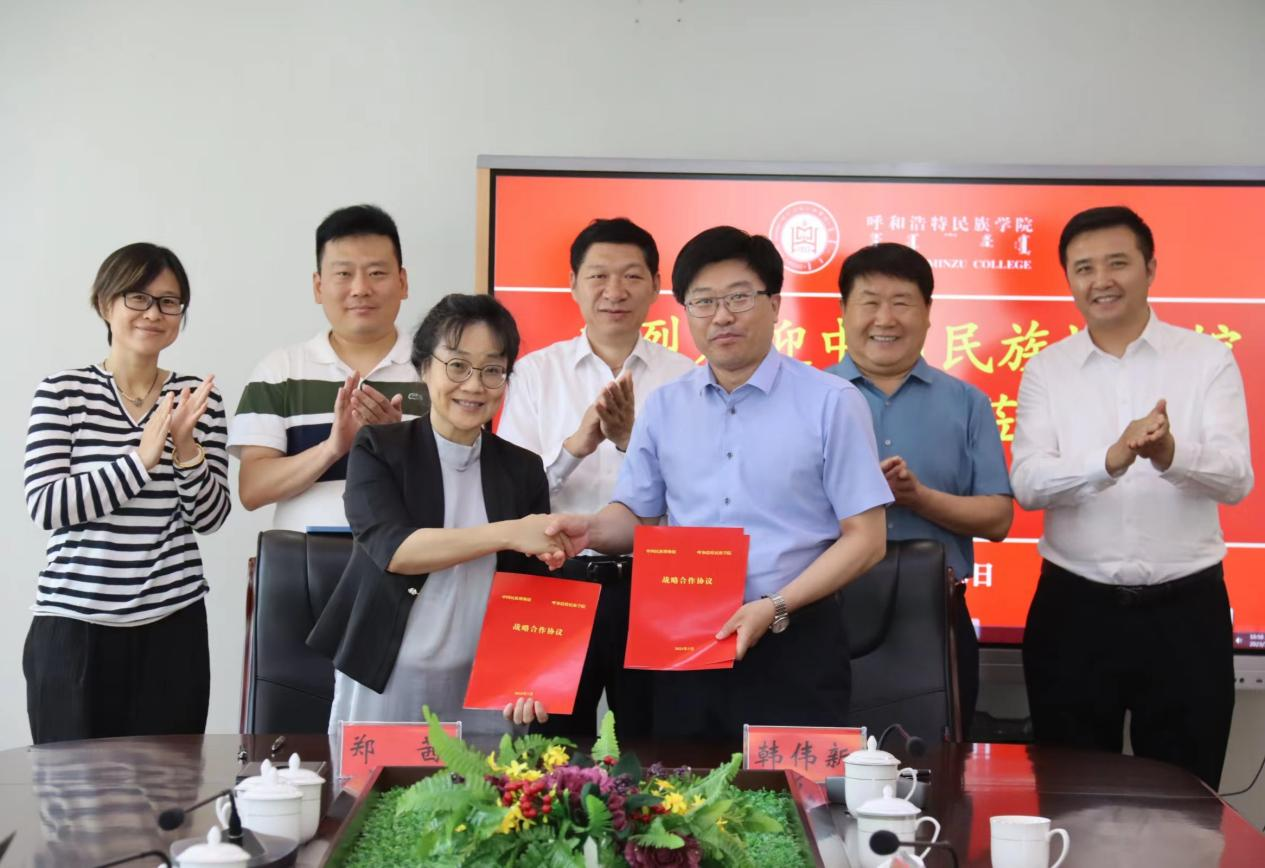 7月15日,呼和浩特民族學(xué)院與中國(guó)民族博物館舉行戰(zhàn)略合作框架協(xié)議簽約儀式。中國(guó)民族博物館副館長(zhǎng)鄭茜、校黨委書記劉九萬(wàn)、校黨委副書記、校長(zhǎng)韓偉新出席簽約儀式并座談交流。雙方有關(guān)部門負(fù)責(zé)人參加簽約儀式。