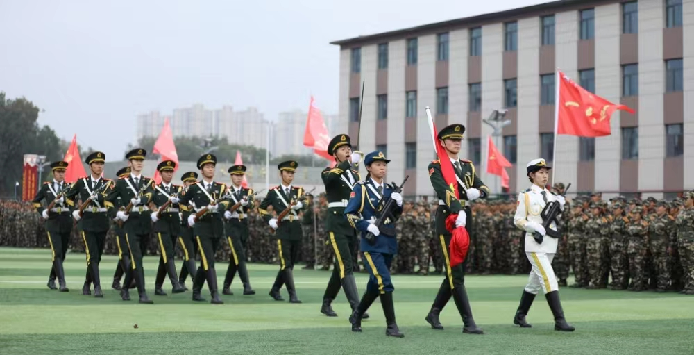 在莊嚴(yán)的國(guó)歌聲中,五星紅旗冉冉升起,2023級(jí)新生軍訓(xùn)總結(jié)表彰大會(huì)拉開(kāi)序幕。劉九萬(wàn)代表學(xué)校向承訓(xùn)單位贈(zèng)送錦旗表示感謝,并下達(dá)分列式“開(kāi)始”指令。