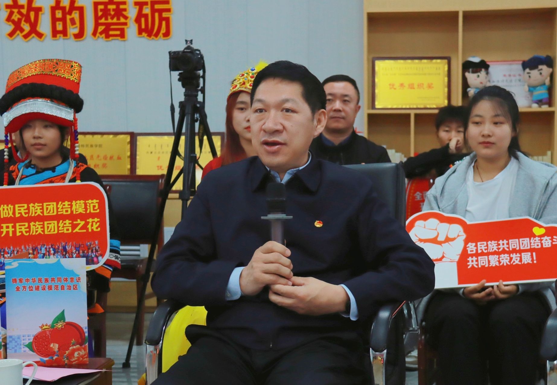 劉九萬寄語同學們,要勤于學習,把學習放在首位,為民族復興、強國建設求真學問,練真本領,做到不負青春、不負韶華;要勇于擔當,切實肩負起新時代新征程黨賦予的使命任務,在中國式現代化建設中挺膺擔當;要善于團結,弘揚民族團結進步的優良傳統,把團結融入到學習和生活中,做到互相幫助、共同進步。他強調,團員青年要努力爭做中華民族大家庭中的火紅石榴籽,做各族師生交往交流交融的橋梁和紐帶,當好新時代民族團結的踐行者、促進者和守護者,將各民族一家親的信念播撒到更多人的心上,共同建設美麗和諧校園。