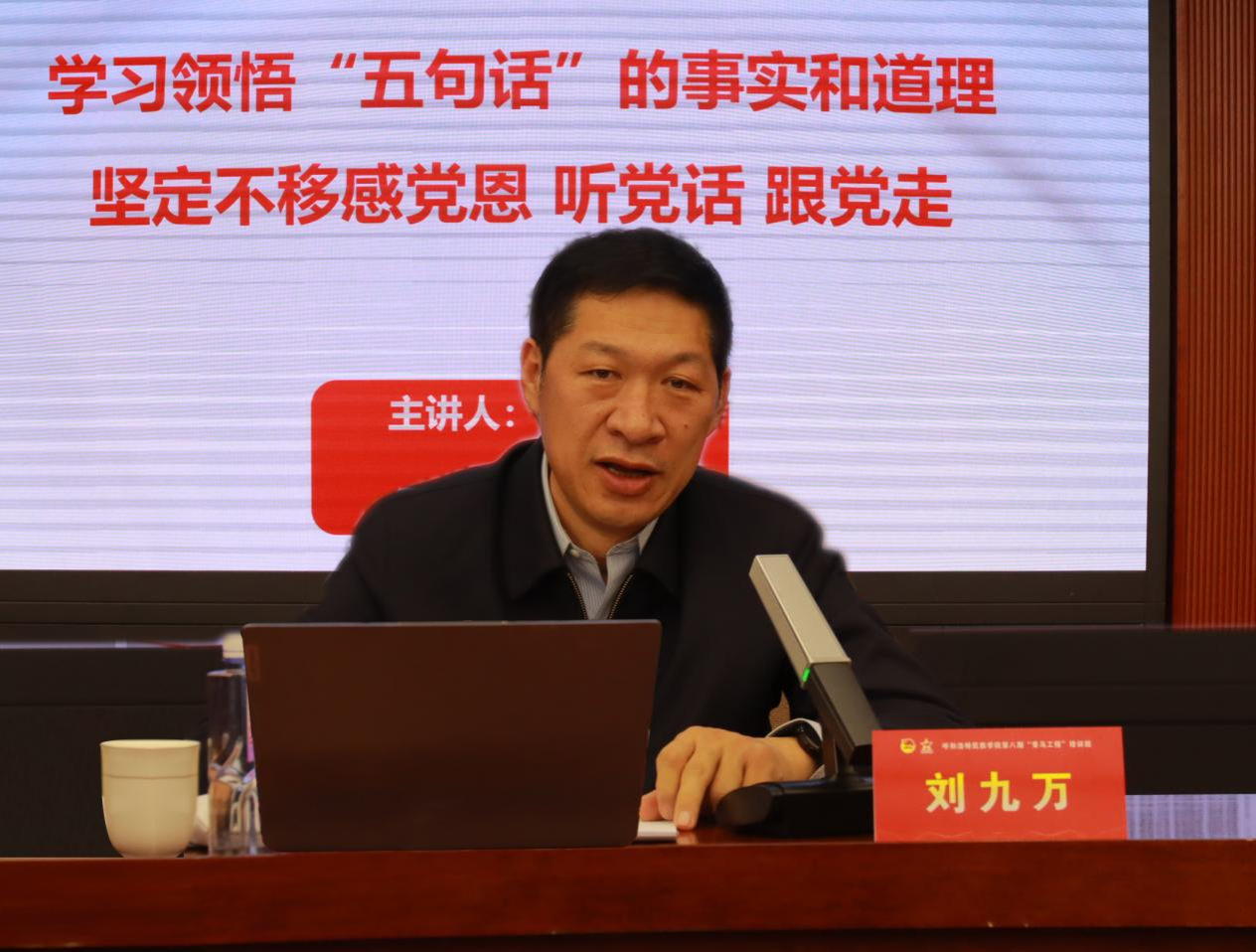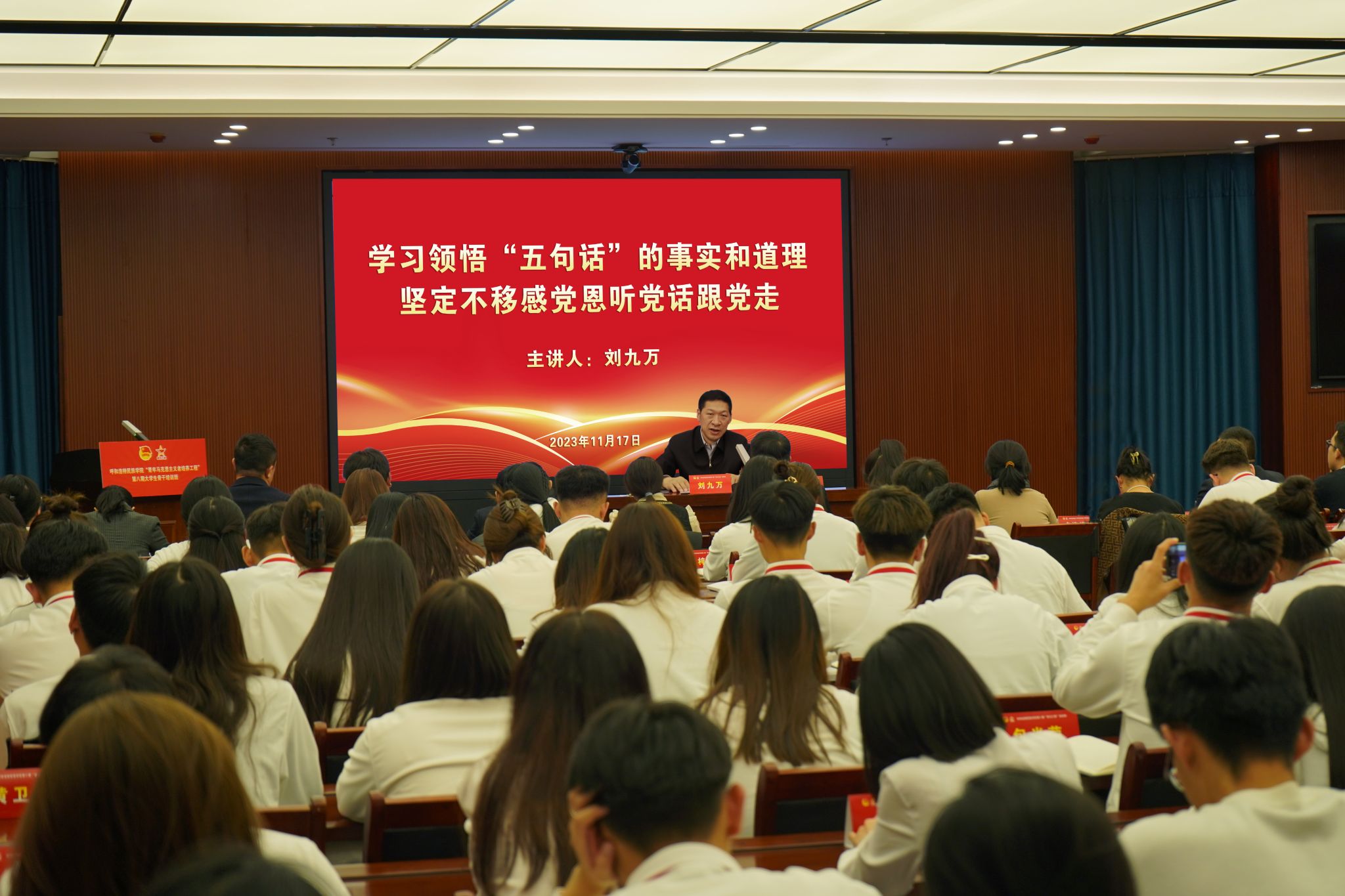 11月17日,學校黨委書記劉九萬在綜合樓12樓會議室為“青馬工程”第八期培訓班學員講授題為“學習領悟‘五句話’的事實和道理 堅定不移感黨恩聽黨話跟黨走”的思政課。