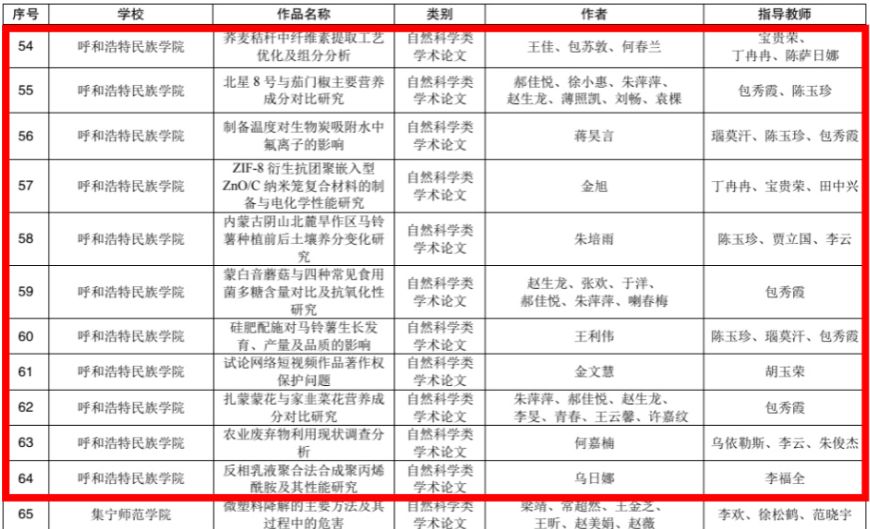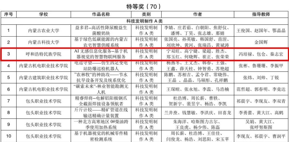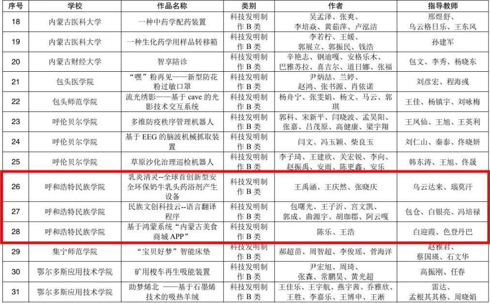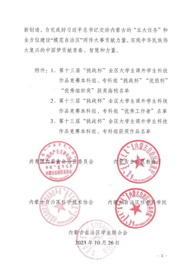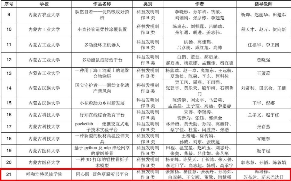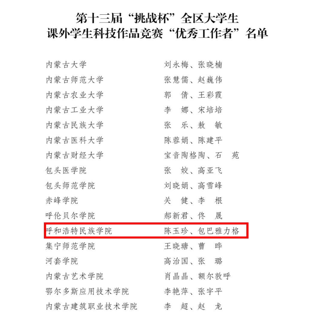 近日,內蒙古自治區第十三屆“挑戰杯”全區大學生課外學術科技作品競賽獲獎名單公布。我校經學院推薦、專家現場評審,最終選送40份作品參加省賽,34份作品獲獎,其中,本科組特等獎2項、一等獎2項、二等獎5項、三等獎25項。學校榮獲“優秀組織獎”,2名老師獲“優秀工作者”榮譽稱號。