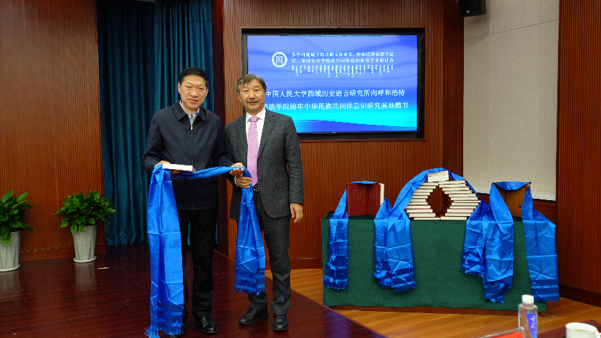 其間,中國人民大學西域歷史語言研究所向呼和浩特民族學院鑄牢中華民族共同體意識研究基地贈書。