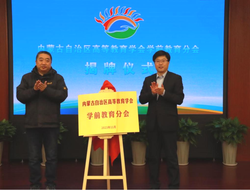 韓偉新和高教學會副秘書長、內蒙古工業大學馬克思主義學院黨委書記王文華共同為學前教育分會揭牌。中國書畫協會副主席彭淼贈送墨寶,學前教育學院黨總支書記娜仁其木格接受饋贈。