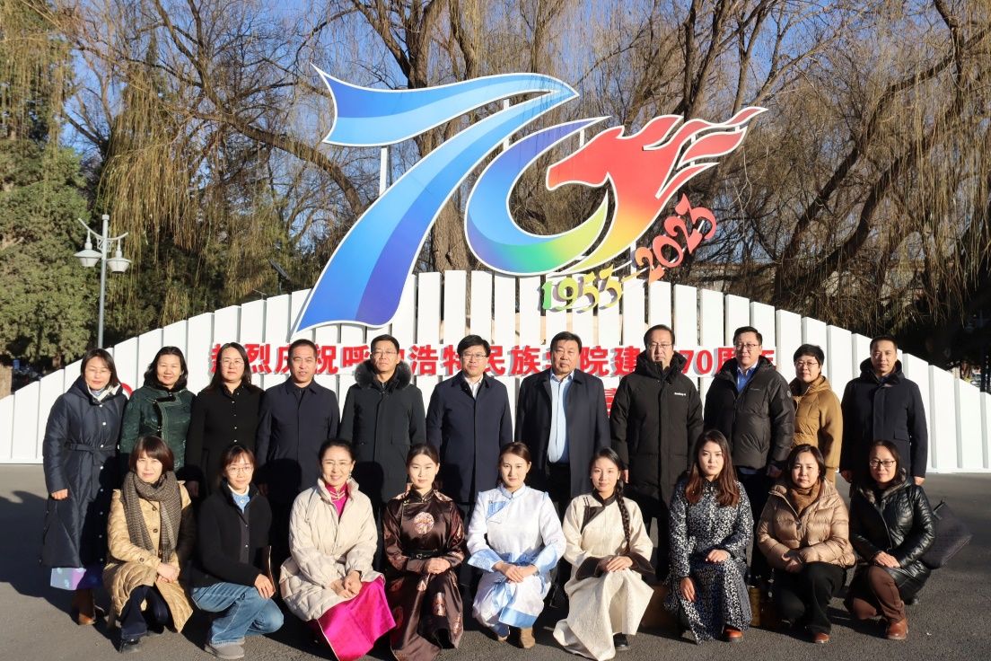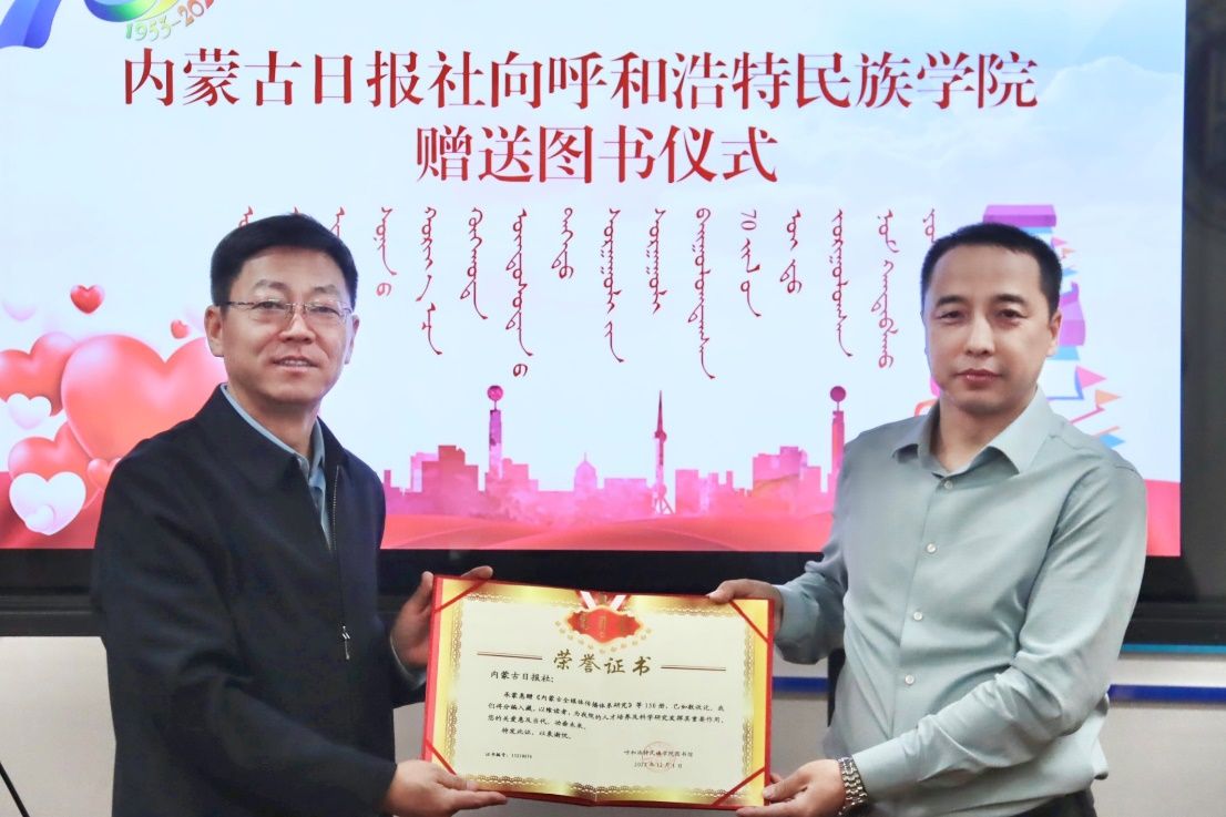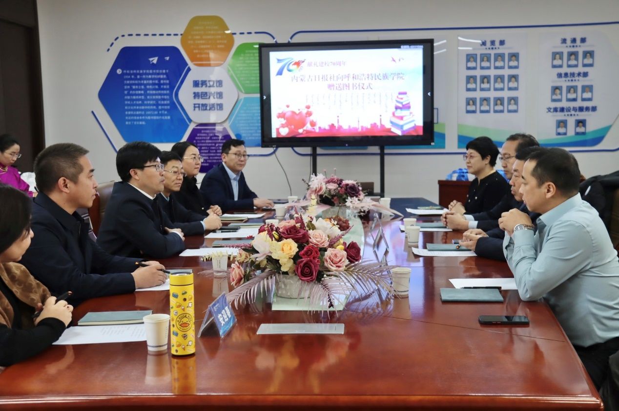 12月1日,適逢呼和浩特民族學院喜迎70周年校慶之際,自治區人大教科文衛委員會副主任委員吳海龍,內蒙古日報社編委委員、素倫嘎新聞中心主任金山等一行四人蒞臨我校贈送圖書。校黨委副書記、校長韓偉新,校黨委委員、副校長高喜天出席贈書儀式。圖書館負責人、新聞傳媒學院領導班子及師生代表參加了贈書儀式。
