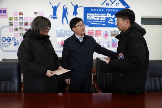 韓偉新代表學校對受災學生致以親切問候,并關切詢問了學生家庭受災情況、家人身體狀況及受災后的生活安置情況,為受災家庭學生送上慰問金,鼓勵其以積極樂觀的心態正視家庭遇到的困難,安心在校學習,不負青春韶華,繼續努力奮斗,將來更好地建設家鄉、回饋社會。格根哈斯鼓勵受災家庭學生要勇敢面對困難與挫折,學會在逆境中成長,囑咐學校相關部門要進一步做好受災學生幫扶工作,確保受災情影響學生應助盡助。