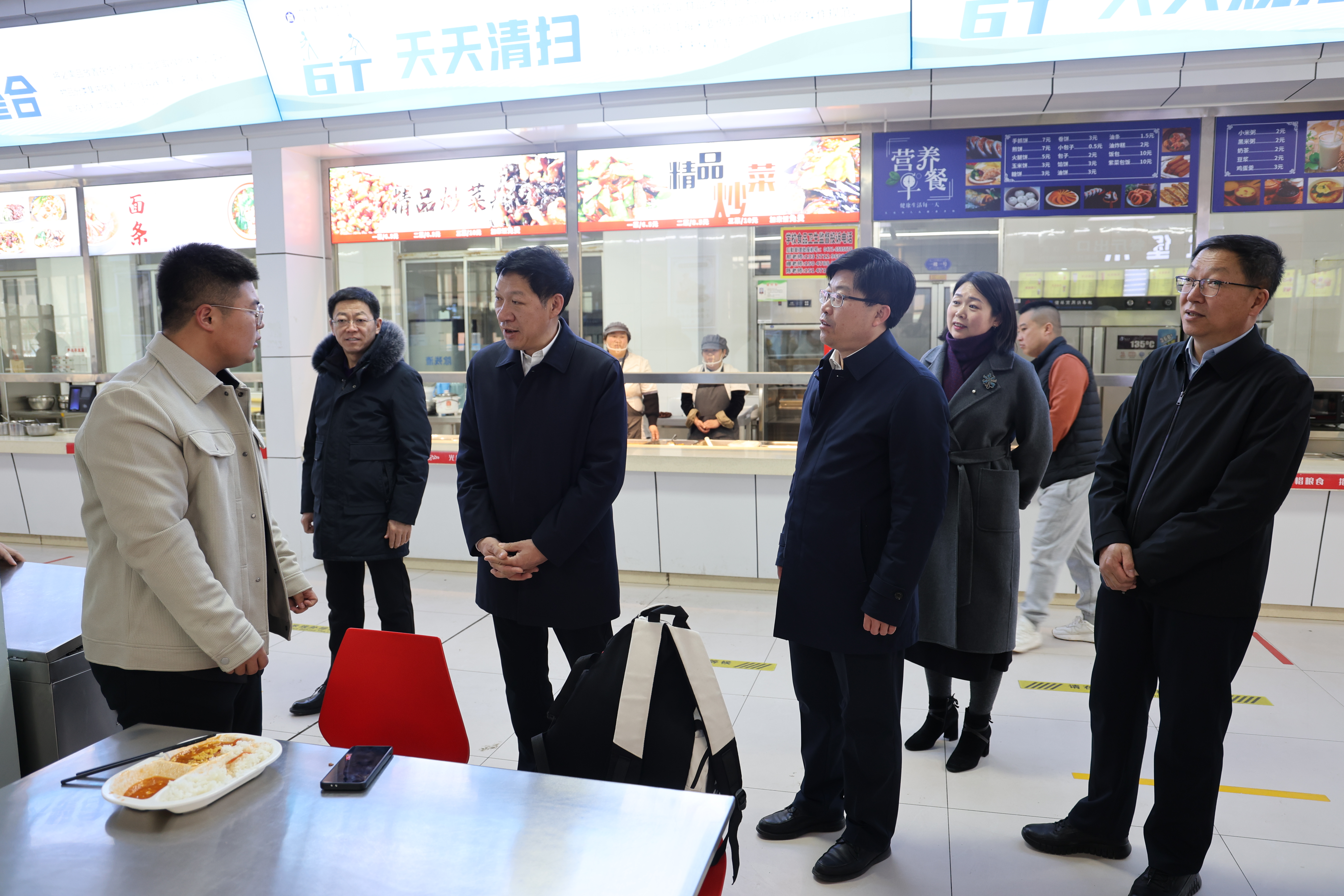 校領導一行與學生進行親切交談,了解學生們的學習、生活及思想動態并對學生食堂、實驗實訓場所、宿舍、教學樓等重點部位進行大檢查。重點圍繞餐飲服務保障工作、消防安全、危化品存儲及用電、用水日常管理情況等展開檢查,對存在問題提出明確整改要求,并詳細了解各部門安全管理制度及執行情況。