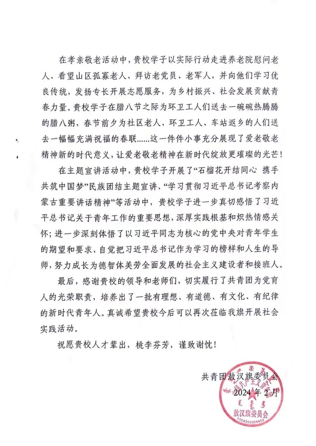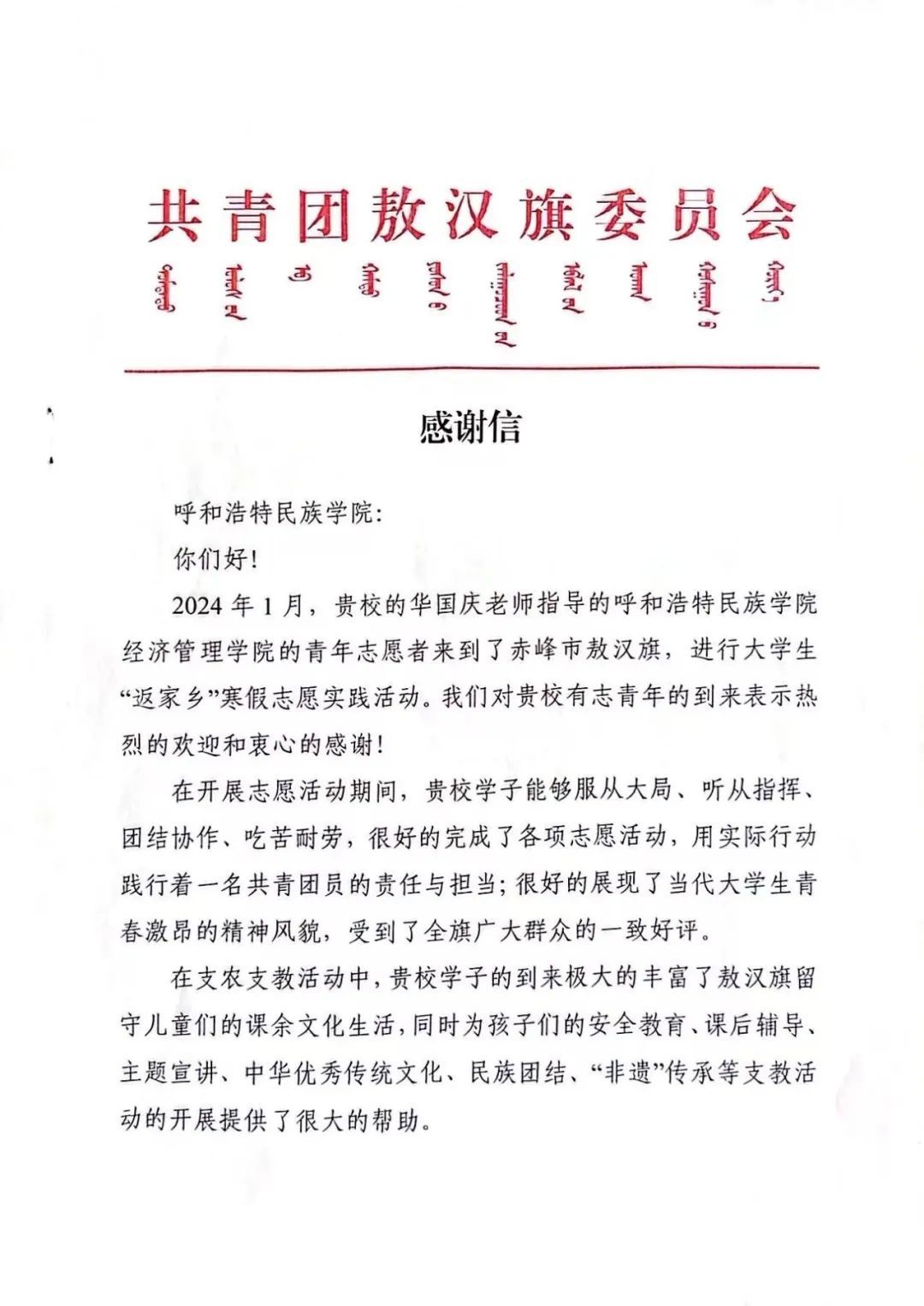 近日,學校收到一封來自共青團敖漢旗委員會的感謝信,信中對學校經濟管理學院青年志愿者在赤峰市敖漢旗開展的大學生“返家鄉”寒假志愿實踐活動中的優異表現給予高度肯定和贊揚,對學校志愿者表示了由衷的感謝和誠摯的敬意。
