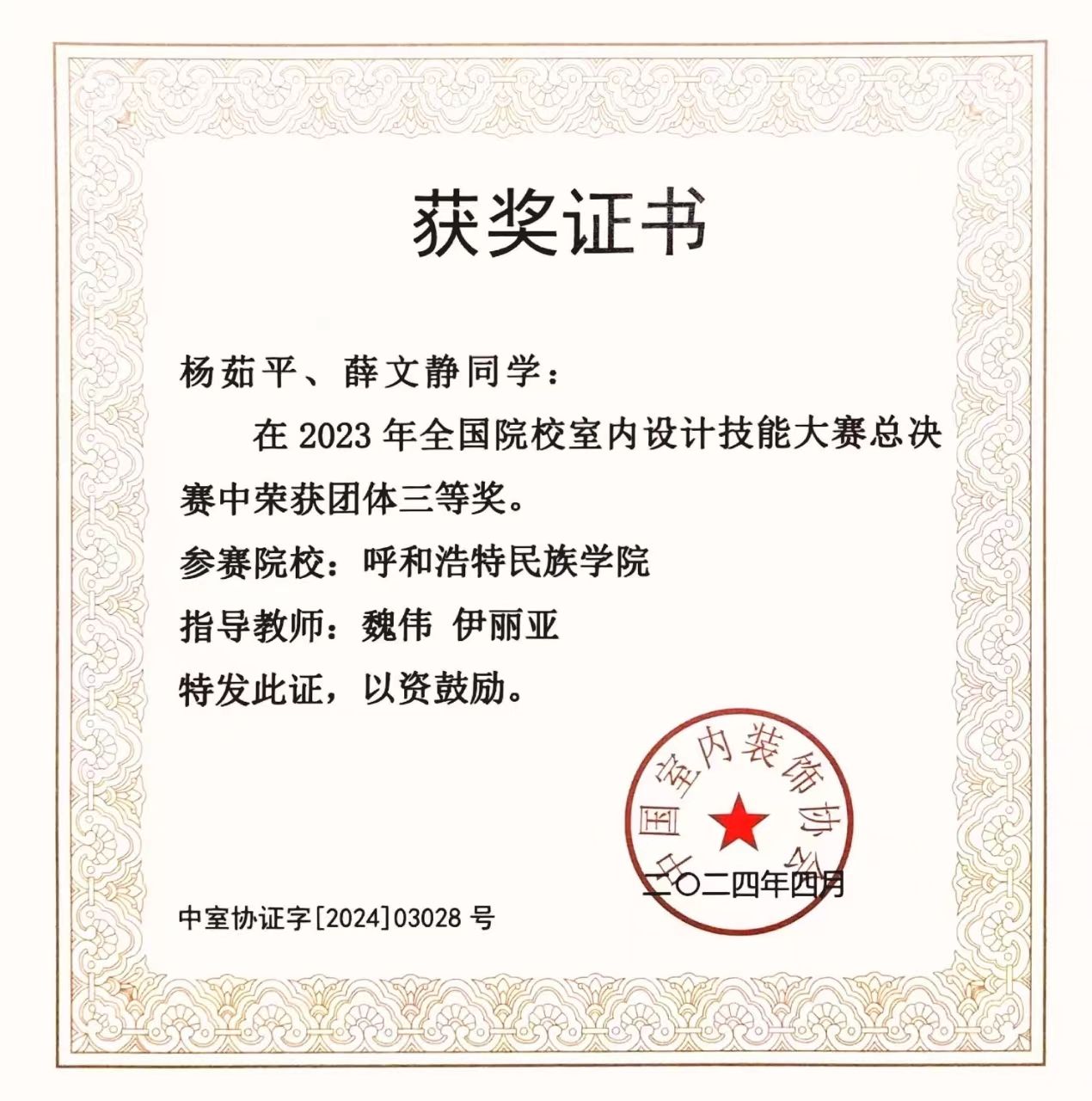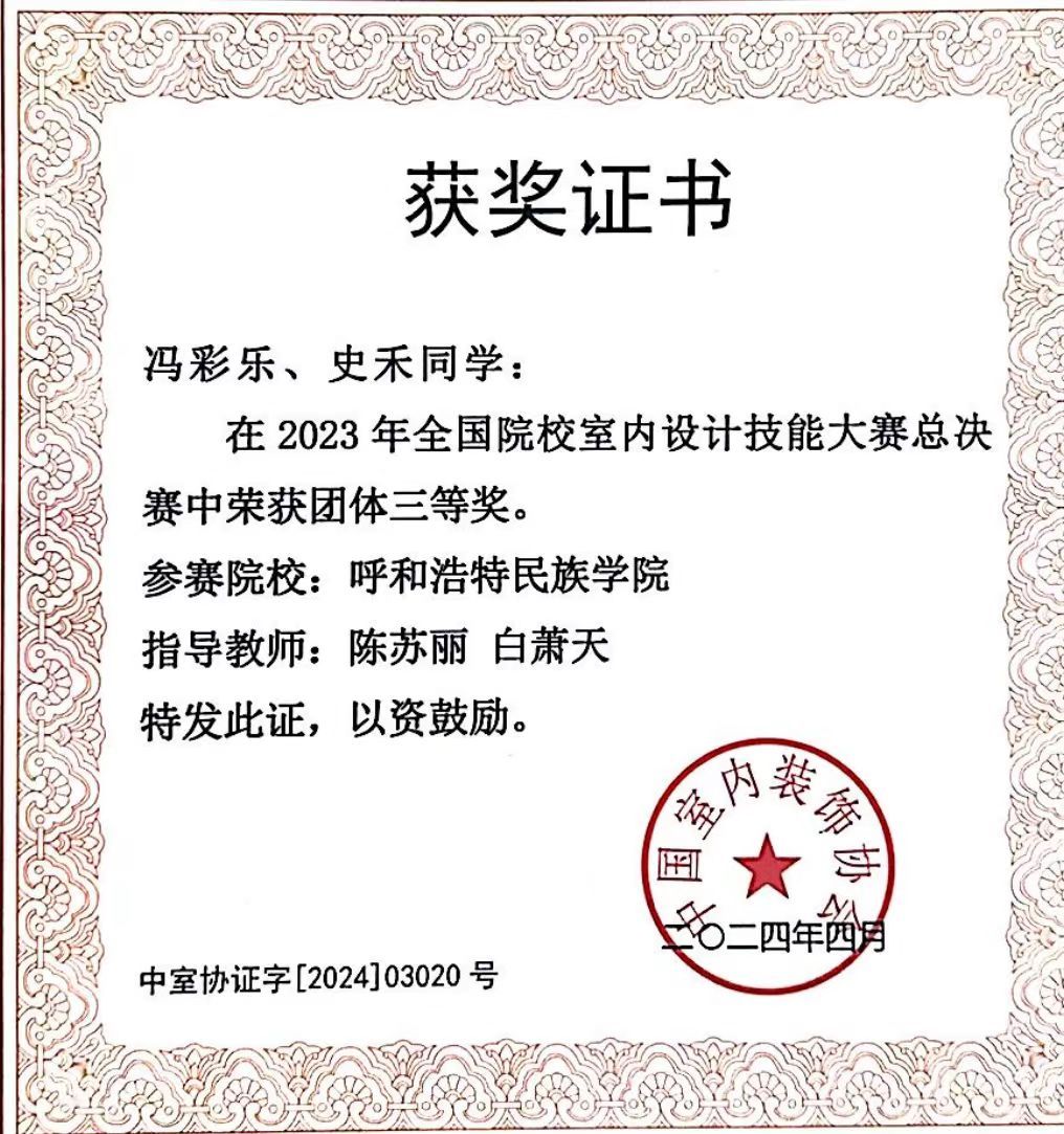 近日,由中國室內裝飾協會、教育部職業院校藝術設計類專業教學指導委員會、環境藝術設計類專業委員會組織舉辦的2023年全國院校室內設計技能大賽總決賽圓滿落幕,我校魏偉、伊麗亞兩位教師指導的《尺壁寸陰--大學生活動中心設計》(學生:楊茹平、薛文靜),陳蘇麗、白蕭天兩位教師指導的《對話達芬奇—大學生活動中心設計》(學生:馮彩樂、史禾)兩部作品榮獲本科組團體三等獎,成為本次比賽中唯一獲獎的內蒙古自治區本科院校,取得了自治區在全國設計類競賽線下賽事上的新突破!