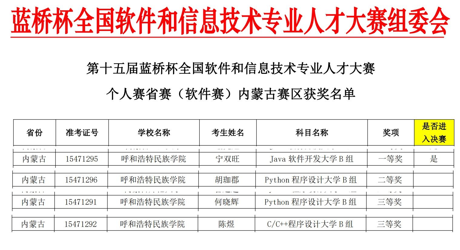 本屆大賽分為個人賽和團隊賽兩大項,我校選手參加了軟件類個人賽,其中計算機科學學院的寧雙旺同學榮獲Java軟件開發組一等獎,胡珈郡同學榮獲Python程序設計組二等獎,陳煜同學榮獲C/C++程序設計組三等獎,何曉輝同學榮獲Python程序設計組三等獎的佳績。寧雙旺同學將代表學校參加第十五屆“藍橋杯”全國軟件和信息技術專業人才大賽——個人賽國賽(軟件類)。