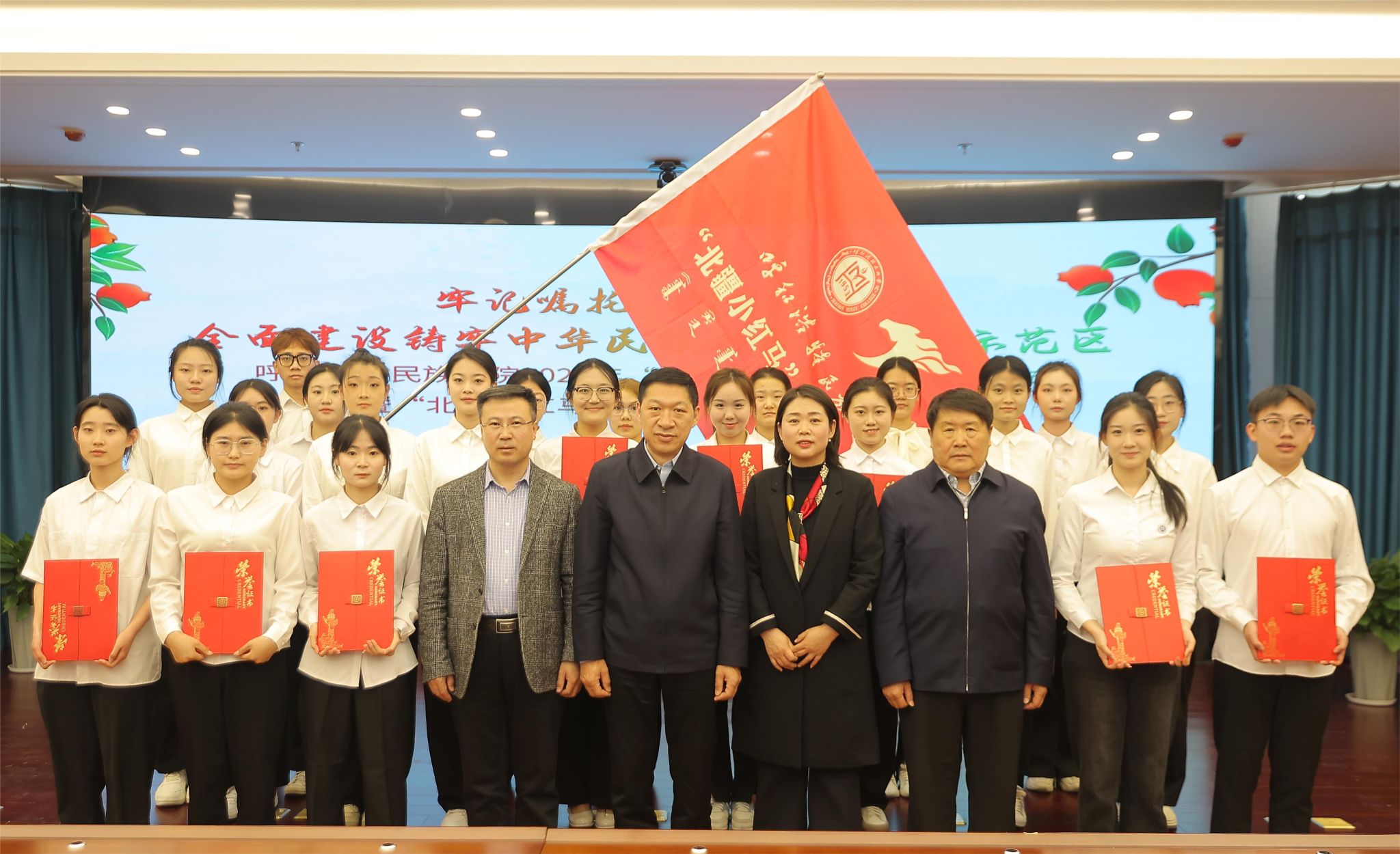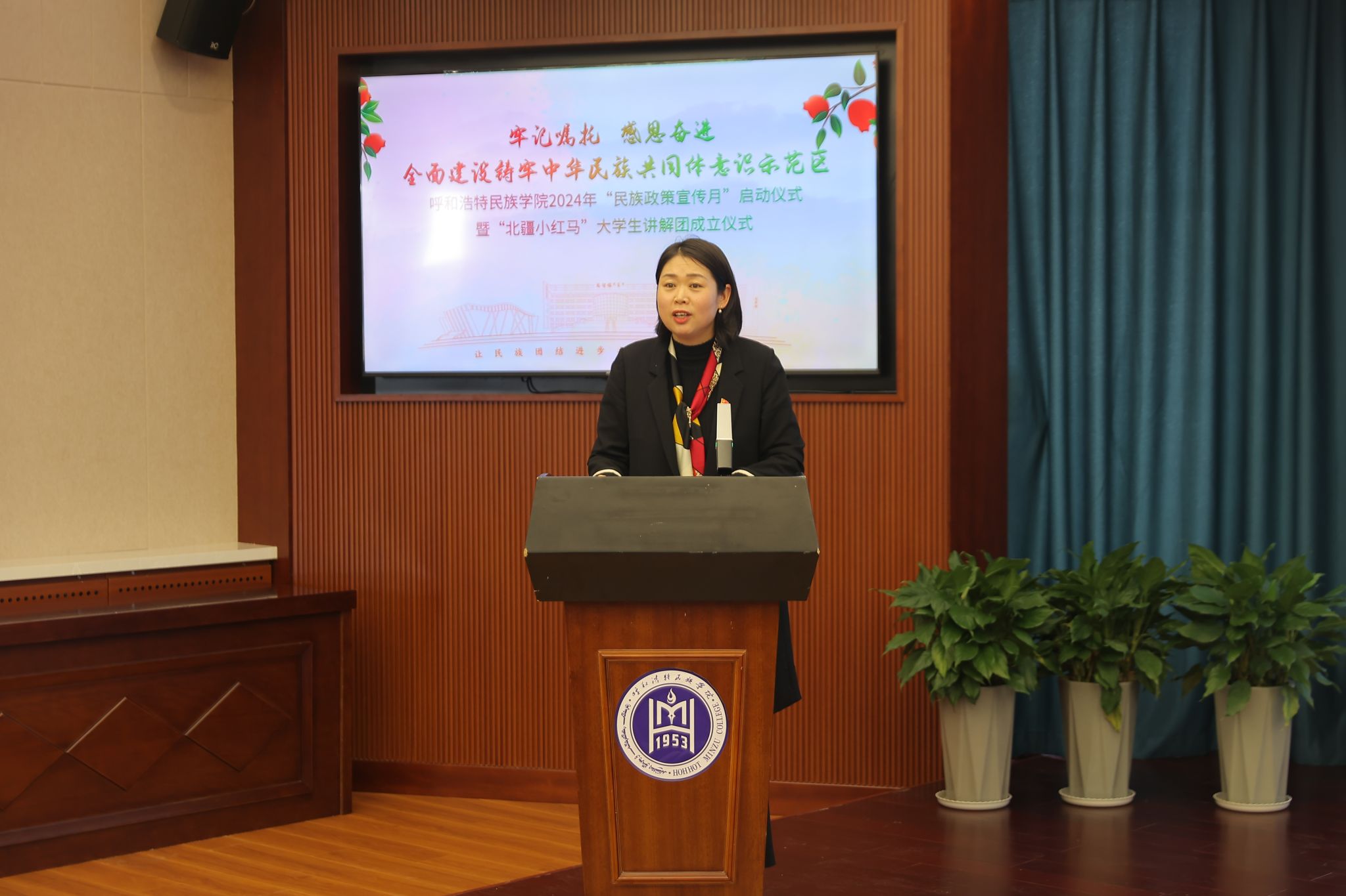 儀式上,劉九萬向“北疆小紅馬”大學生講解團指導教師劉麗穎授旗,格根哈斯作了致辭,額爾敦布和向優秀講解員頒發證書,包君解讀了《民族政策宣傳月活動方案》。