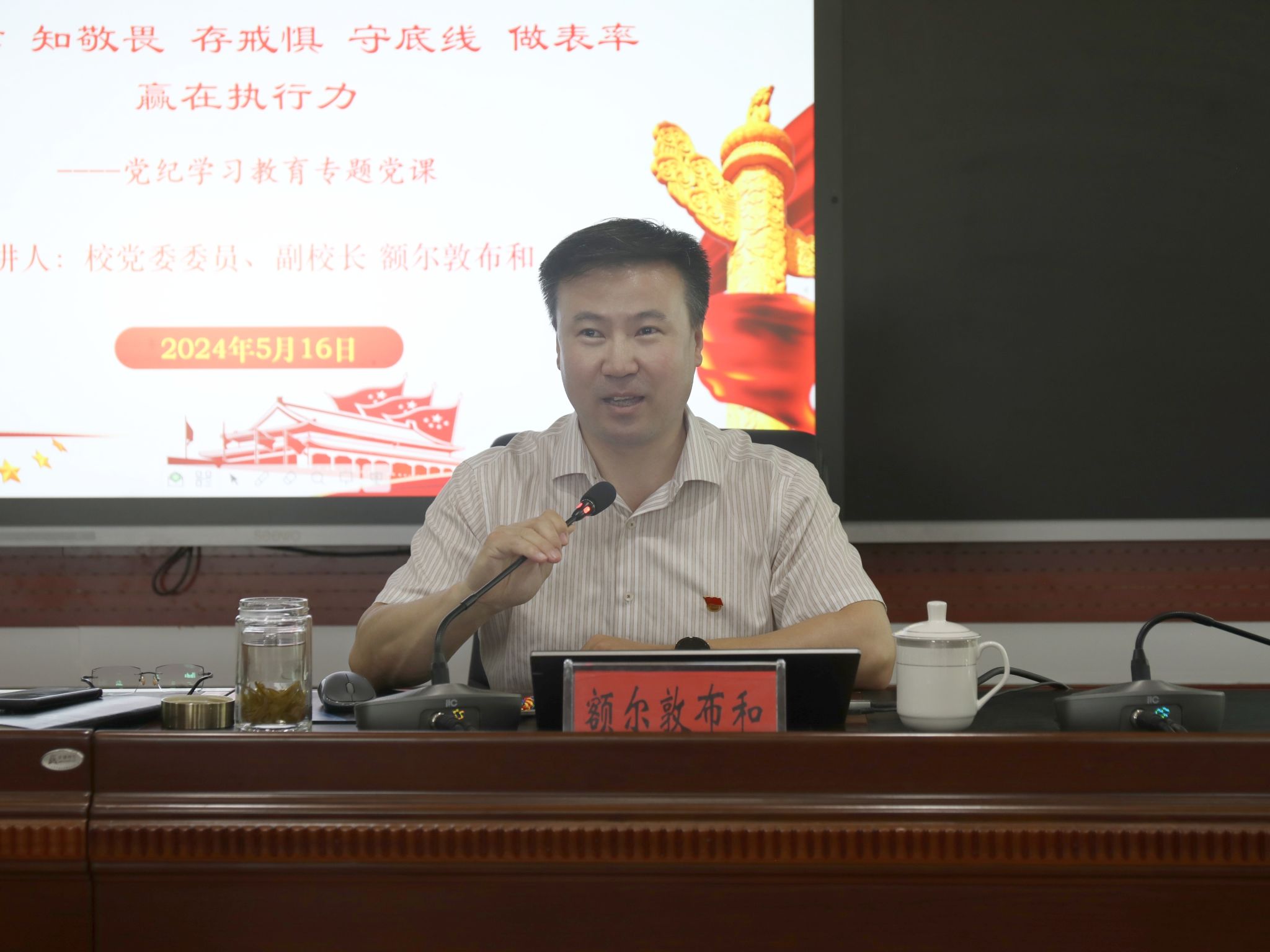 為深入學(xué)習(xí)貫徹習(xí)近平總書(shū)記關(guān)于黨紀(jì)學(xué)習(xí)教育的重要講話和指示精神,5月16日下午,校黨委委員、副校長(zhǎng)額爾敦布和以“明紀(jì)律 知敬畏 存戒懼 守底線 做表率 贏在執(zhí)行力”為題講授專題黨課。