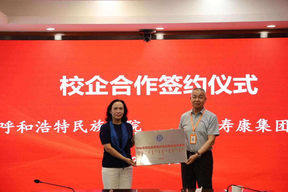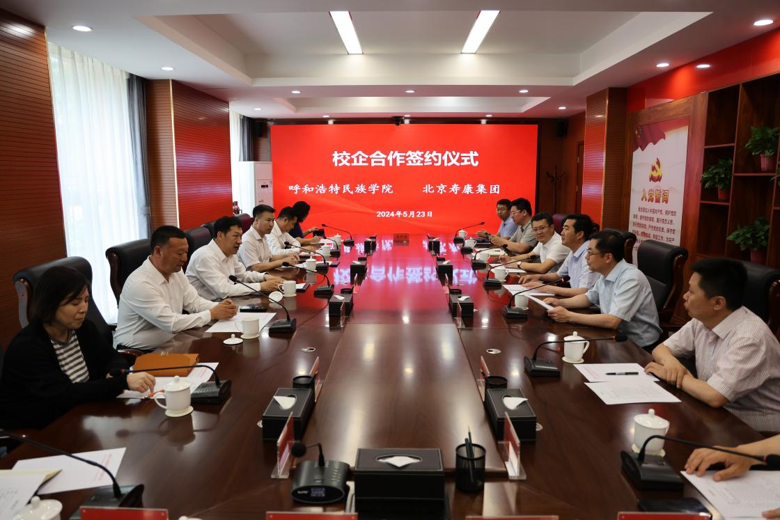 下午,校黨委書記劉九萬,黨委委員、副校長額爾敦布和一行赴內蒙古文化與旅游投資集團參觀考察,簽訂合作協議并進行就業實訓基地授牌儀式。內蒙古文化與旅游投資集團黨委副書記、董事高國輝,北京壽康健康養老產業集團董事長尚占虎、總裁薛鈞發等出席活動。
