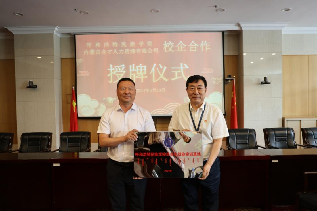 上午,校黨委書記劉九萬一行赴內蒙古合才人力資源有限公司、內蒙古誠諾合才人力資源有限公司拓展就業崗位,簽訂合作協議并進行就業實訓基地授牌儀式。