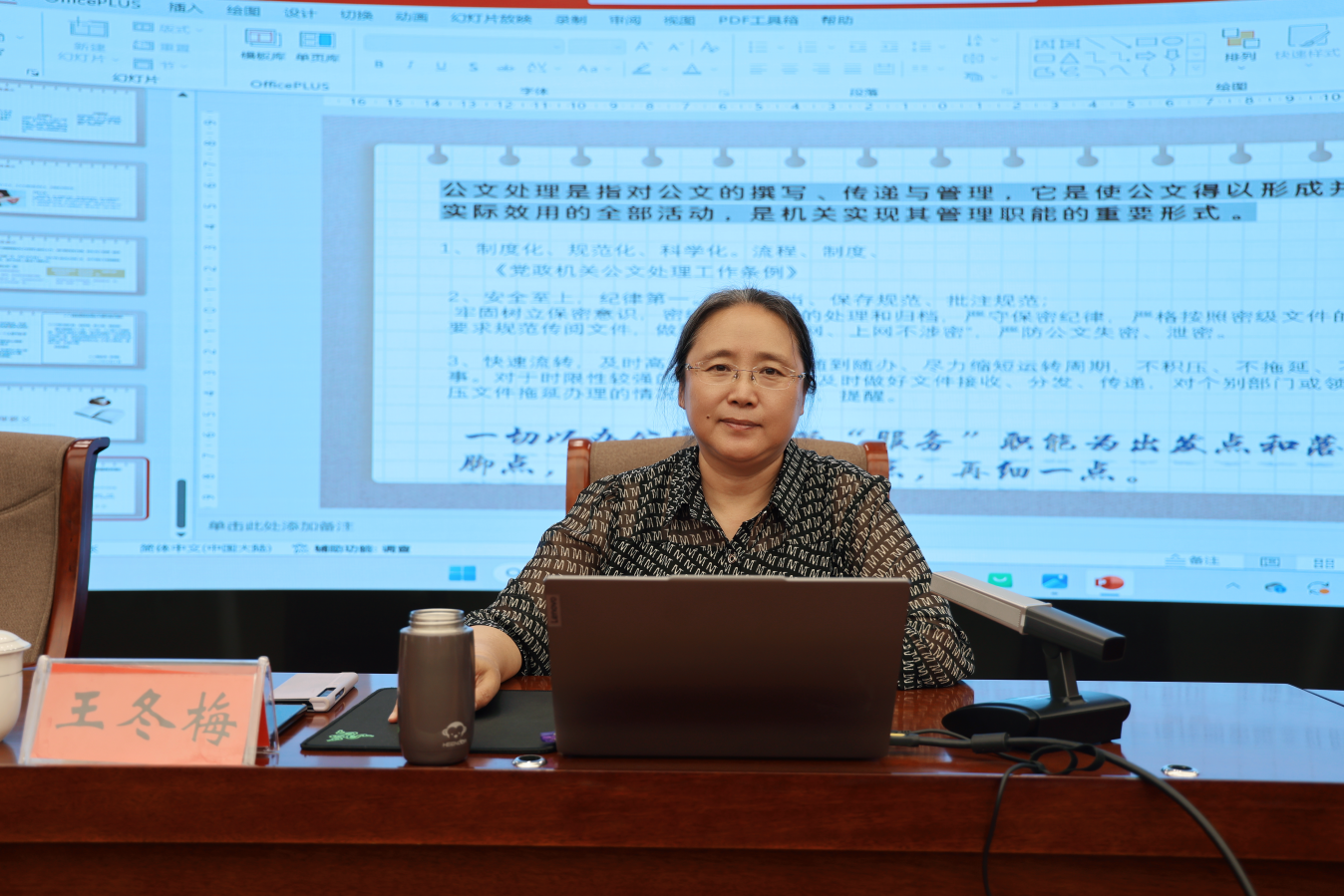 王冬梅以《公文寫作與處理的基本技能》為題,從公文的概念、種類、格式規范、寫作要求、一般步驟等方面,對公文寫作的基本原則、行文規范、常見問題等進行了深入淺出的講解,并結合多年公文寫作經驗,通過大量鮮活的案例,生動闡釋了撰寫高質量公文的基本方法。