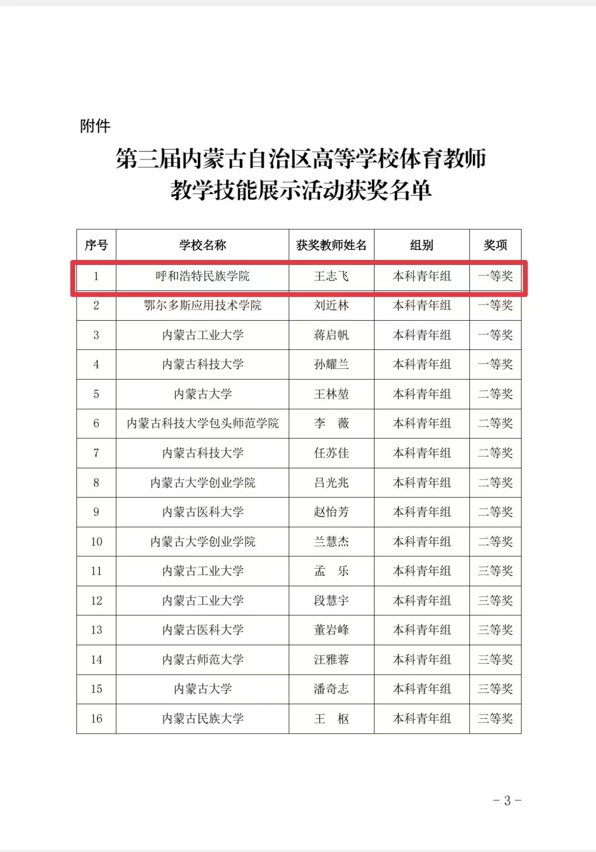 我校體育學院教師王志飛在自治區(qū)教育廳主辦的第三屆內(nèi)蒙古自治區(qū)高等學校體育教師教學技能展示活動中榮獲本科青年組第一名。該賽事由自治區(qū)教育廳組織區(qū)外 16 位全國高等學校體育教學指導委員會專家進行評審,經(jīng)過網(wǎng)絡評審和現(xiàn)場測試兩個環(huán)節(jié)評選而出。