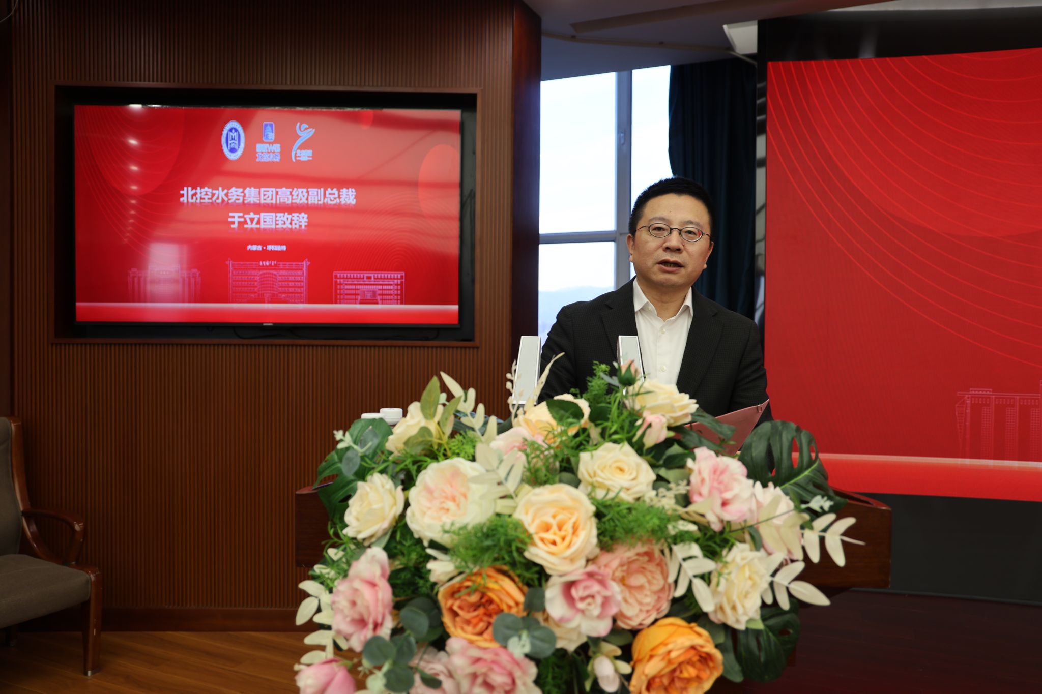 于立國在致辭中介紹了北控水務集團概況,以及在產教融合領域十多年探索實踐取得的豐碩成果。他表示,北控水務高度重視此次合作,認為學校人才培養理念與北控水務集團的發展理念與方向高度契合,期望以共建產業學院為契機,開拓校企合作領域,深化校企合作內涵,將教育深度融入產業發展中,協同發揮資源優勢,全面助力生態環境類高等教育進步發展。
