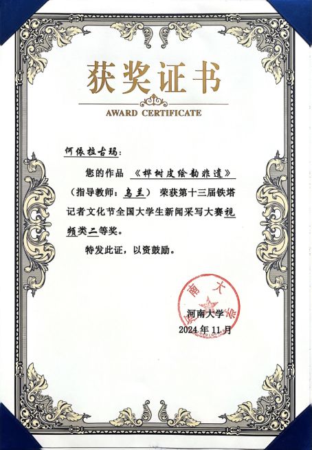 近日,由河南大學(xué)主辦、河南大學(xué)新聞與傳播學(xué)院承辦的第十三屆鐵塔記者文化節(jié)全國(guó)大學(xué)生新聞采寫大賽進(jìn)行了獲獎(jiǎng)作品公示。我校新聞傳媒學(xué)院烏蘭老師指導(dǎo)的作品《樺樹(shù)皮繪韻非遺》(學(xué)生:何依拉古瑪),榮獲視頻類二等獎(jiǎng)。