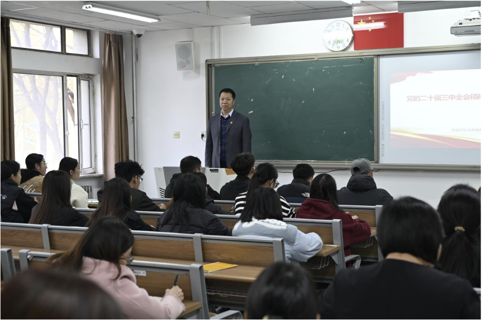 課堂上,雙虎分四個部分對二十屆三中全會的重要內容和精神實質進行詳細解讀,結合法學專業的特點,強調了法治建設在推進中國式現代化進程中的重要作用。他說,法學專業的學生肩負著維護社會公平正義、推進法治建設的重要使命,要認真學習領會黨的二十屆三中全會精神,將其融入到專業學習和未來的職業實踐中。他鼓勵同學們要樹立正確的法治觀念,不斷提高自己的法律素養和專業能力,為我國的法治建設貢獻自己的力量。