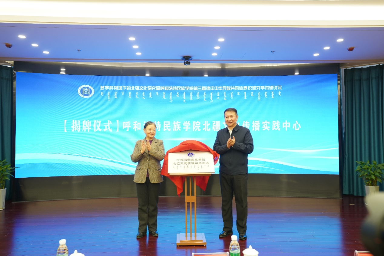 研討會開幕期間還舉行了呼和浩特民族學院北疆文化傳播實踐中心揭牌儀式暨頒發聘任書儀式。周曉梅、云冰為中心揭牌,額爾敦布和為吳海龍、包金花頒發中心聘書。