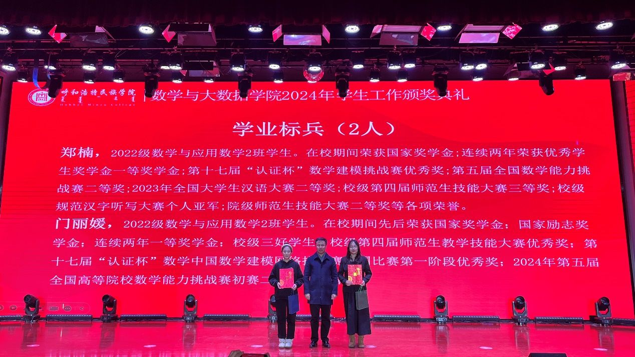 為進一步激發學生的愛國熱情和學習動力,激勵師生再接再厲、奮發有為,11月29日,數學與大數據學院在北院圖書館二樓報告廳舉辦“表彰優秀樹榜樣,揚帆啟航創輝煌”為主題的2024年學生工作表彰頒獎典禮暨文藝晚會。校黨委委員、副校長額爾敦布和出席晚會并為獲獎學生頒獎。