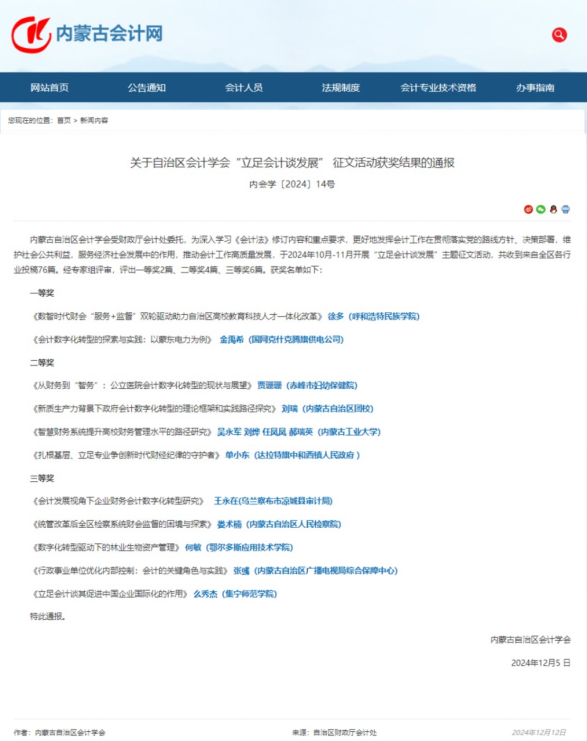 近日,內(nèi)蒙古自治區(qū)會計學會公布“立足會計談發(fā)展”征文活動獲獎結(jié)果,我校財務處徐多題為《數(shù)智時代財會“服務+監(jiān)督”雙輪驅(qū)動助力自治區(qū)高校教育科技人才一體化改革》的征文作品獲得一等獎。