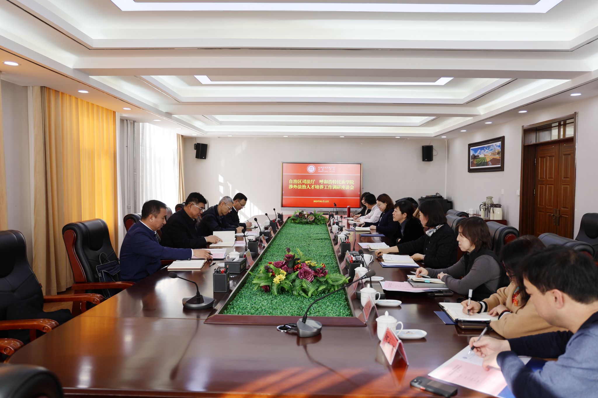 為進(jìn)一步做好法治人才培養(yǎng)工作,加強(qiáng)法治建設(shè),3月12日,自治區(qū)黨委依法治區(qū)辦副主任、司法廳黨委書記、廳長(zhǎng)白永平,自治區(qū)司法廳黨委委員、副廳長(zhǎng)張生,司法廳相關(guān)處室負(fù)責(zé)人一行來我校開展專題調(diào)研。會(huì)前,校黨委書記劉九萬(wàn)會(huì)見了白永平一行。黨委副書記、校長(zhǎng)王敏,黨委副書記格根哈斯與白永平一行座談交流。