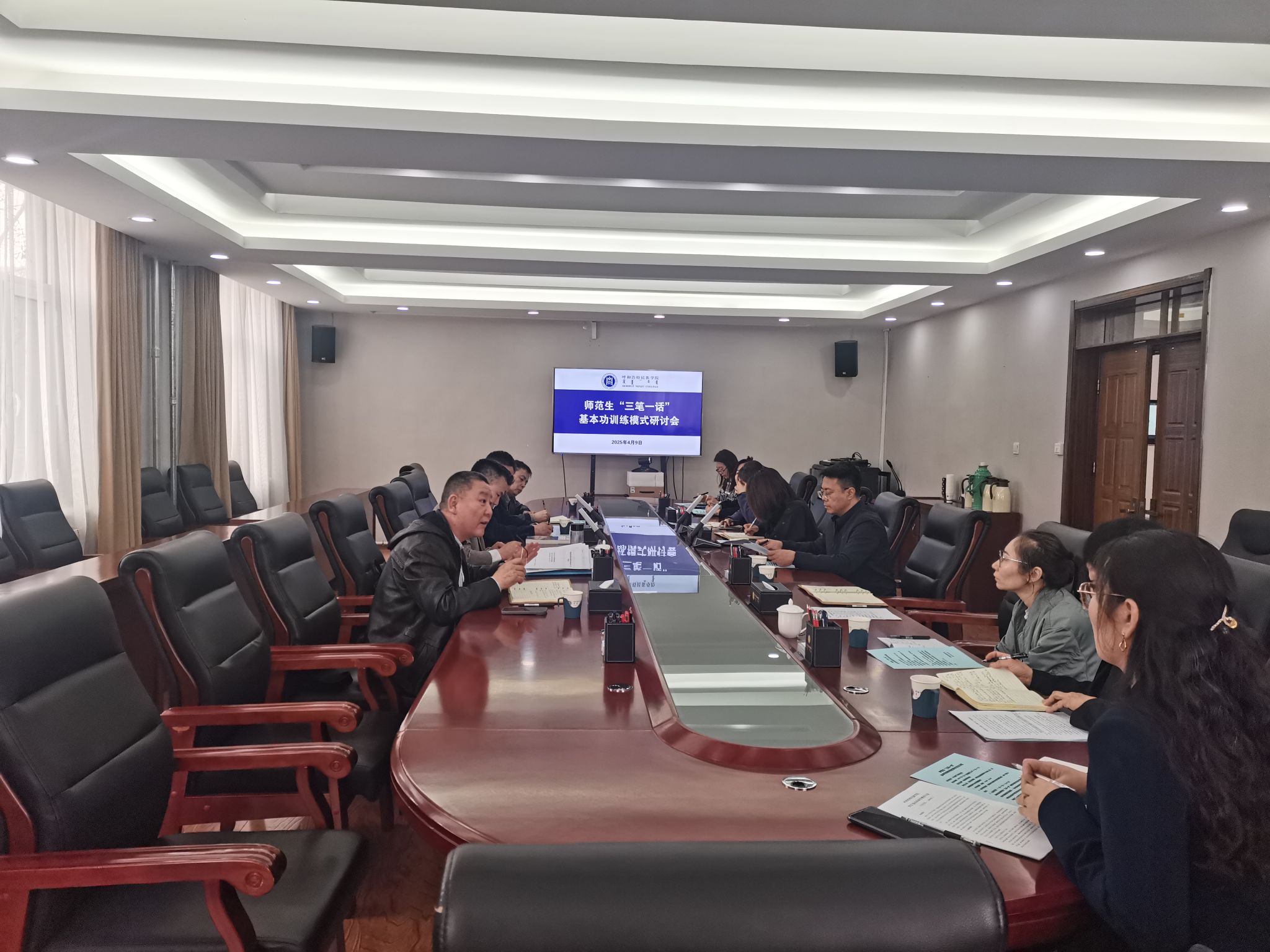 為落實人才培養方案,達成畢業要求相關能力點,進一步強化師范生基本功訓練,學校師范生技能訓練中心于4月9日組織召開了“三筆一話”基本功訓練模式研討會。校黨委委員、副校長額爾敦布和出席會議并講話,設置師范類專業的學院相關負責人、師范生技能訓練中心全體人員參會。
