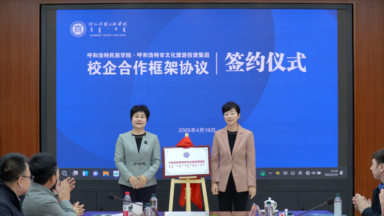 4月19日,學(xué)校在綜合樓11會議室與呼和浩特市文化旅游投資集團舉行校企合作框架協(xié)議簽約儀式。簽約前,校黨委書記劉九萬與呼和浩特市文化旅游投資集團黨委書記、董事長高麗芳一行共同參觀了學(xué)校鑄牢中華民族共同體意識教育館、校史館、非遺展廳。