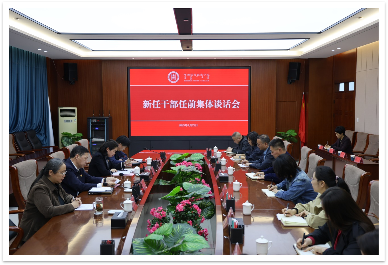 4月23日,學(xué)校在綜合樓11樓會議室召開了新任處級干部集體談話會。校黨委書記劉九萬,黨委副書記格根哈斯,黨委委員、紀委書記、監(jiān)察專員王冬梅,黨委委員、組織部部長吳阿古拉出席會議。會議由格根哈斯主持。17名平級調(diào)整干部、進一步使用處級干部、新提拔處級干部參加會議。