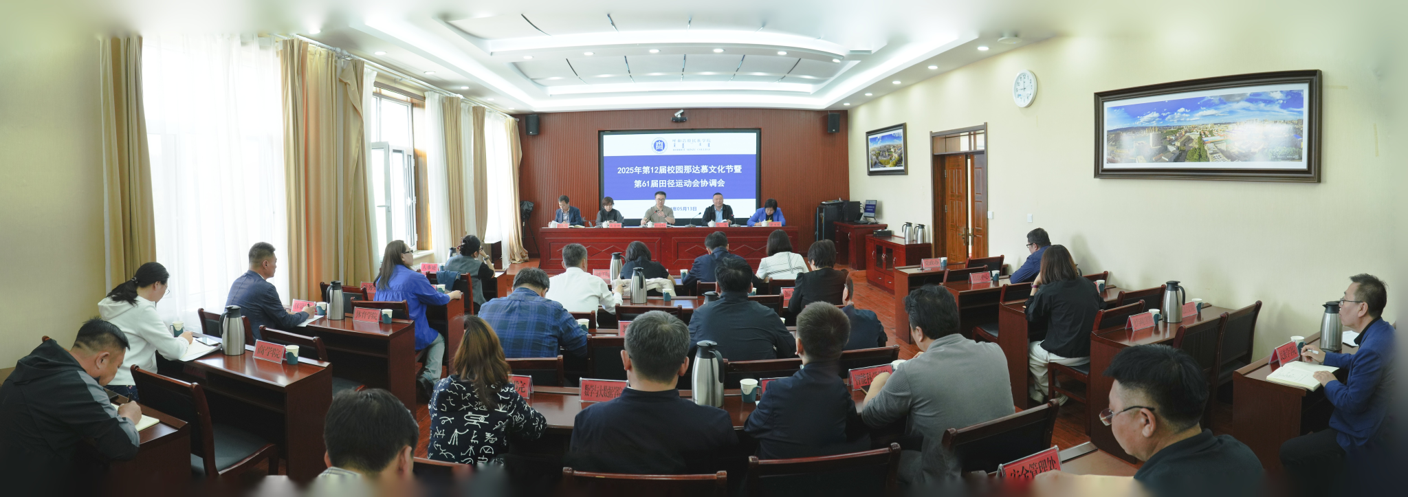 為統籌做好第12屆校園那達慕文化節暨第61屆田徑運動會,5月13日,校黨委委員、副校長額爾敦布和在辦公樓四樓會議室主持召開協調會,各相關部門負責人、各學院院長參會。