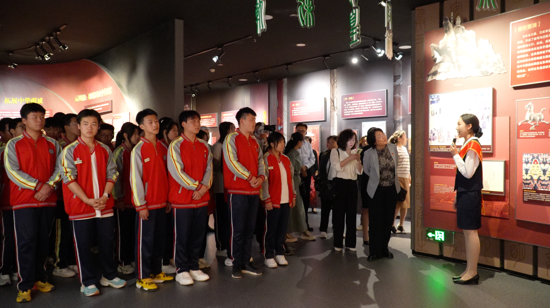座談會后,呼和浩特市智能技術應用學校師生在鑄牢中華民族共同體意識教育館進行“行走的思政課”實踐教學。兩校思政課教師依托教育館豐富的展陳資源,現(xiàn)場切磋交流思政課教學方法。全體師生跟隨講解員走過“我們從哪里來”、“我們是誰”、“我們要到哪里去”等三部分主題展廳,通過圖文展板,數(shù)字演示和現(xiàn)場互動體驗,有形有感有效鑄牢中華民族共同體意識。