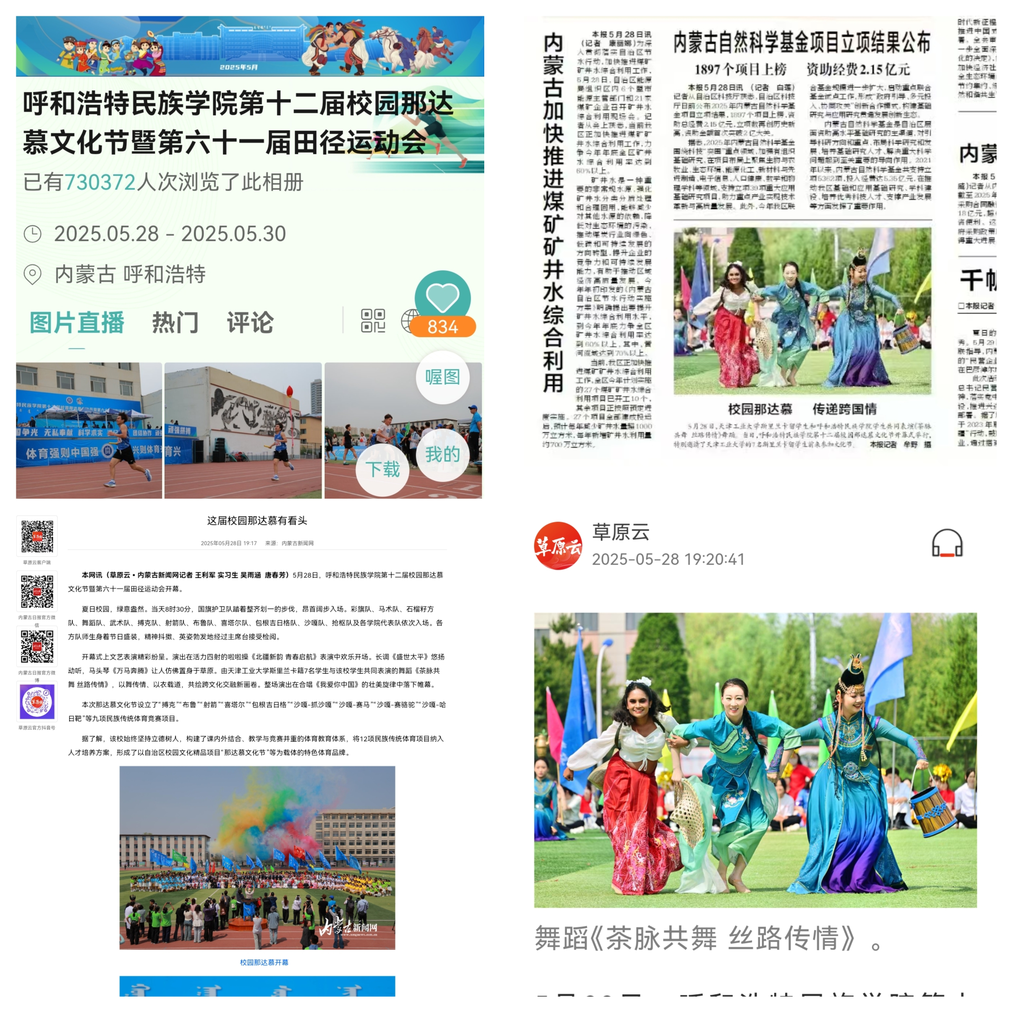 5月30日中午,學校第十二屆校園那達慕文化節暨第六十一屆田徑運動圓滿閉幕。校黨委書記劉九萬,黨委副書記、校長王敏,黨委副書記格根哈斯,黨委委員、紀委書記、監察專員王冬梅,黨委委員、副校長高喜天、劉瑞鴻、額爾敦布和、雙虎以及各部門、各學院主要負責人出席閉幕式。本屆盛會實時精選展示1500余張現場精彩圖片,直播獲得73萬+人次瀏覽觀看量,內蒙古日報、內蒙古新聞網、草原云等多家自治區主流媒體宣傳發布我校此次活動。