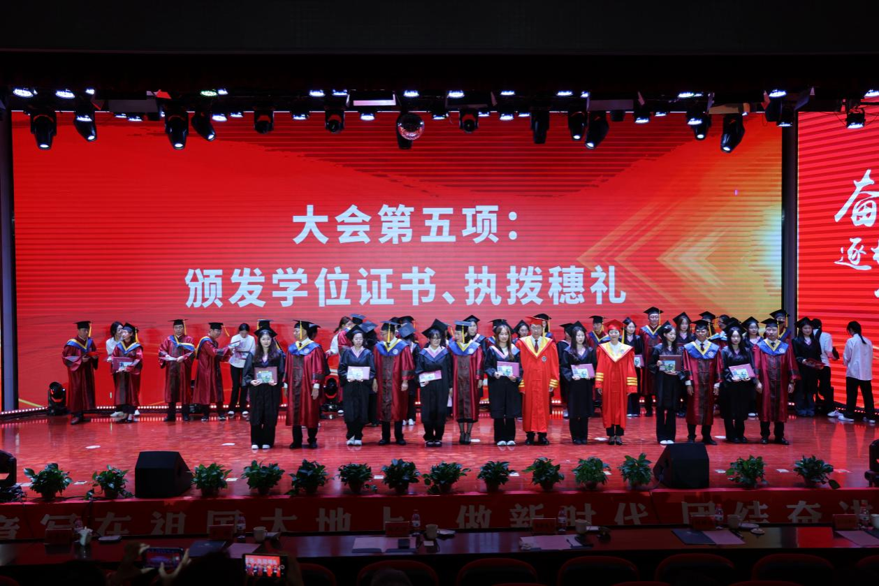 校領(lǐng)導(dǎo)、各學(xué)院院長為學(xué)士學(xué)位獲得者頒發(fā)學(xué)位證書并撥穗。