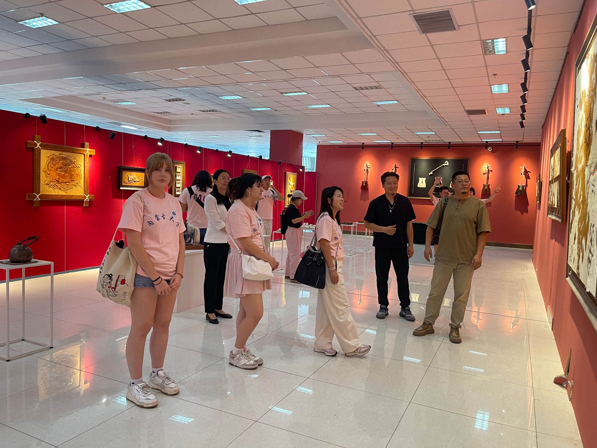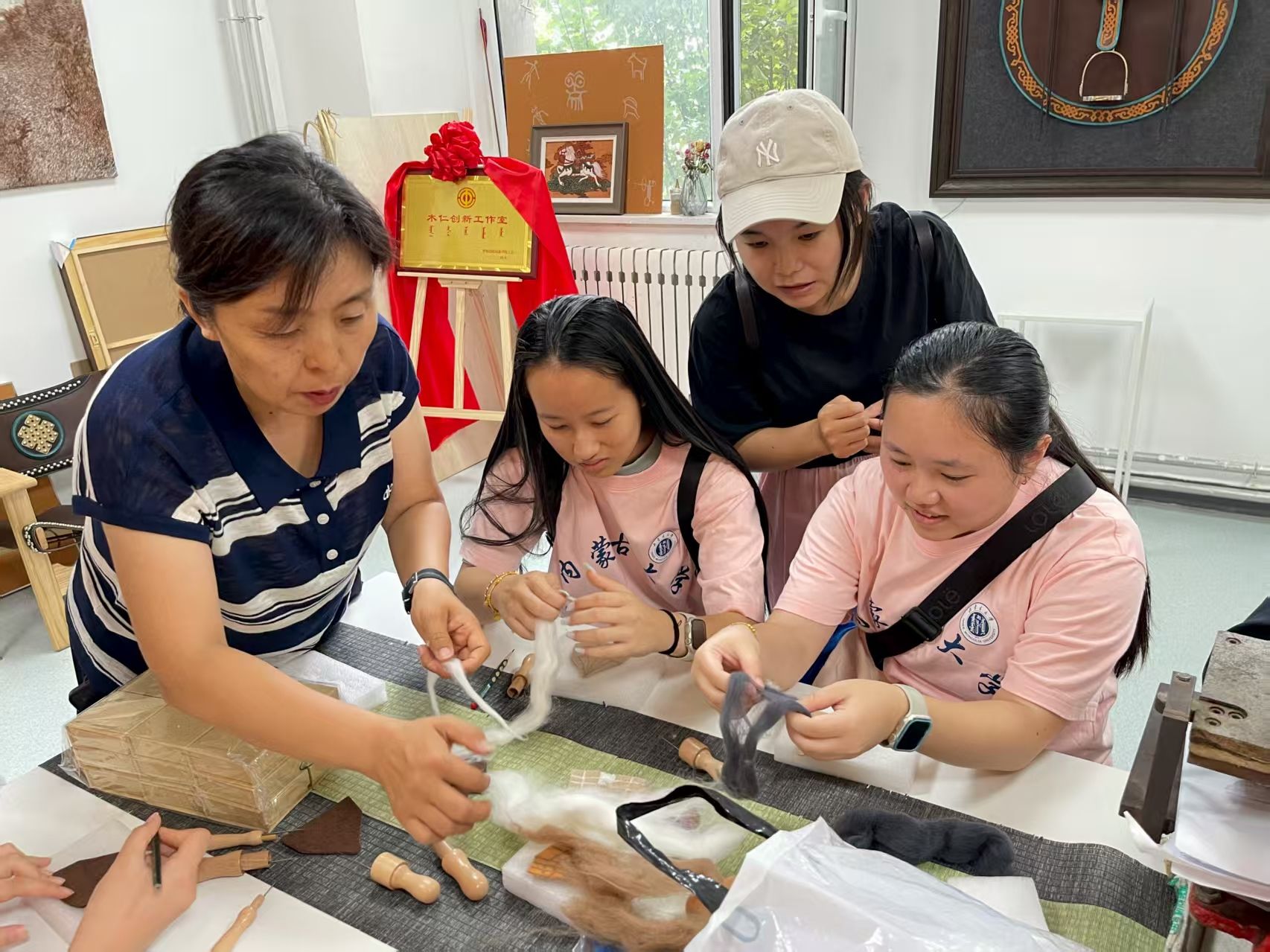 訪問團師生在美術與設計學院參觀了非遺美術作品展,走進自治區級創新工作室“木仁創新工作室”,學習體驗了皮畫、毛氈等非遺美術作品制作,感受到了北疆非遺技藝里的匠心與文化密碼,在創作互動中實現了審美與情感的跨文化共鳴。