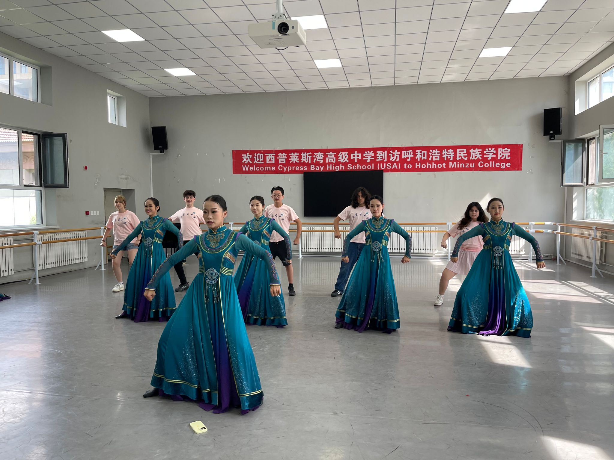 我校音樂與舞蹈學院學生為訪問團師生一行10人展示了舞蹈《茶脈共飲·絲路傳情》《萬麗》及長調民歌、馬頭琴演奏等教學實踐課程。訪問團師生與我校師生進行了互動,跟隨我校學生學習了蒙古族傳統舞蹈,參與了舞蹈實踐表演,從抖肩、擺臂的動作中觸摸到了北疆文化的節奏。