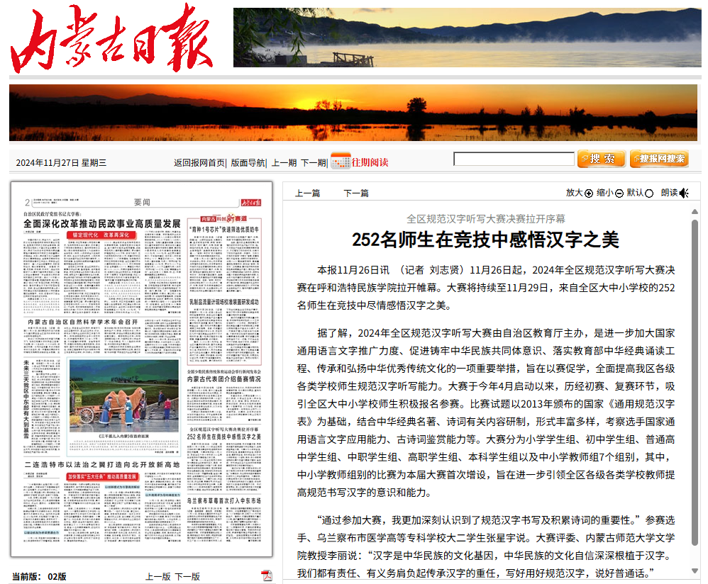 突出以文育人,厚植文化底蘊。開展“三筆字”、演講比賽、師范生技能大賽、經典詩文誦讀、漢聽大賽等活動,在文化浸潤中提升文化內涵。近年,學生在國家和自治區級學科競賽中屢獲佳績;1名學生入選內蒙古作家協會會員,出版長篇小說并獲“萌芽計劃”第三屆全國大學生網絡小說大賽優秀獎,同時創作2部微電影劇本、在“快點”APP發布6部對話小說,展現出扎實的文學創作功底與綜合素養。