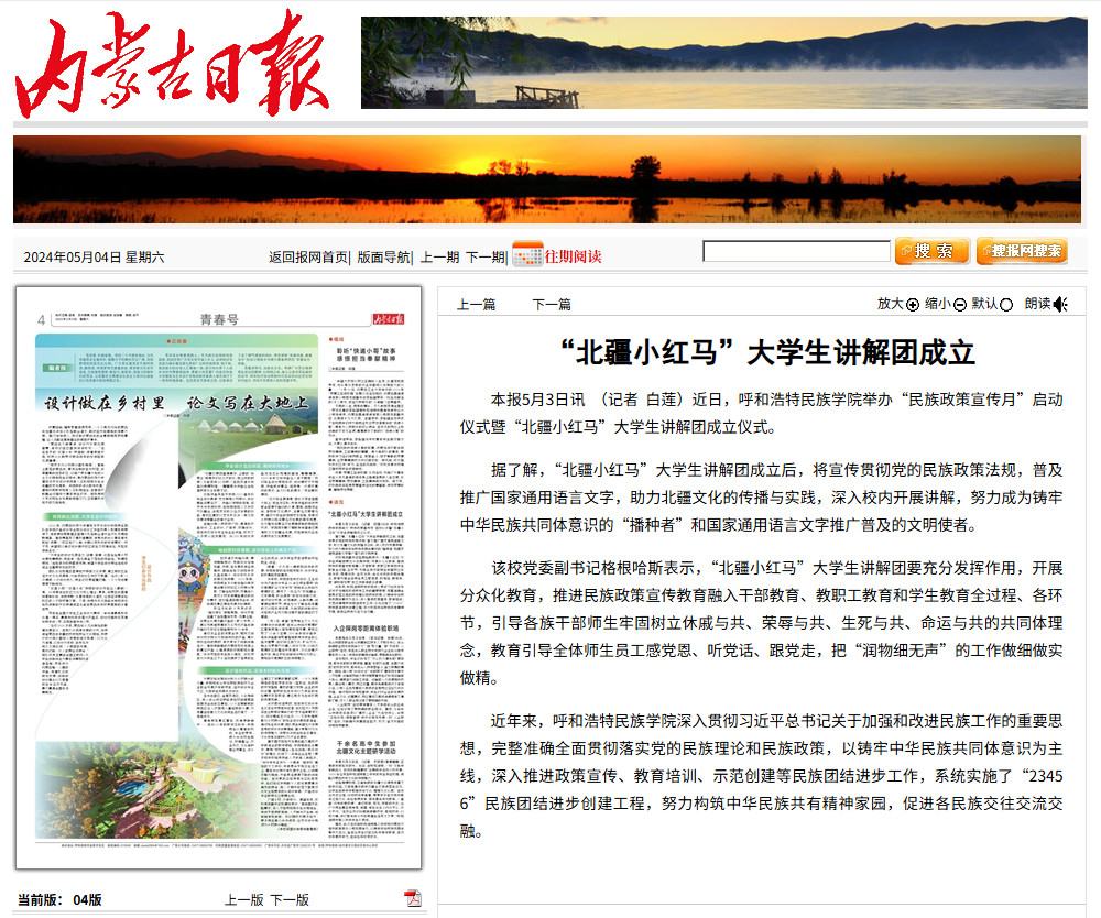打造品牌團隊。組建“北疆小紅馬”大學生講解團,累計接待兩館兩廊參觀團525個,近4萬人次來訪;團隊先后入選2024年全國大學生沂蒙精神志愿宣講團、呼和浩特市民委“青城融講”鑄牢中華民族共同體意識講解團、新城區民委鑄牢中華民族共同體意識宣講團,多次參與自治區民委、呼和浩特市民委大型宣講活動。講解團創新采用“講解+演繹”模式,將民族團結進步故事與沂蒙精神帶入中小學、企業及鄉村振興幫扶點;通過“大手拉小手”培養紅領巾講解員,推動思政教育在不同學段的內容銜接與協同育人。團隊“課本劇里的紅色北疆”創新項目,在學校“北疆文化創新大賽”中榮獲特等獎,將國家通用語言文字推廣與思政教育有效融合。
