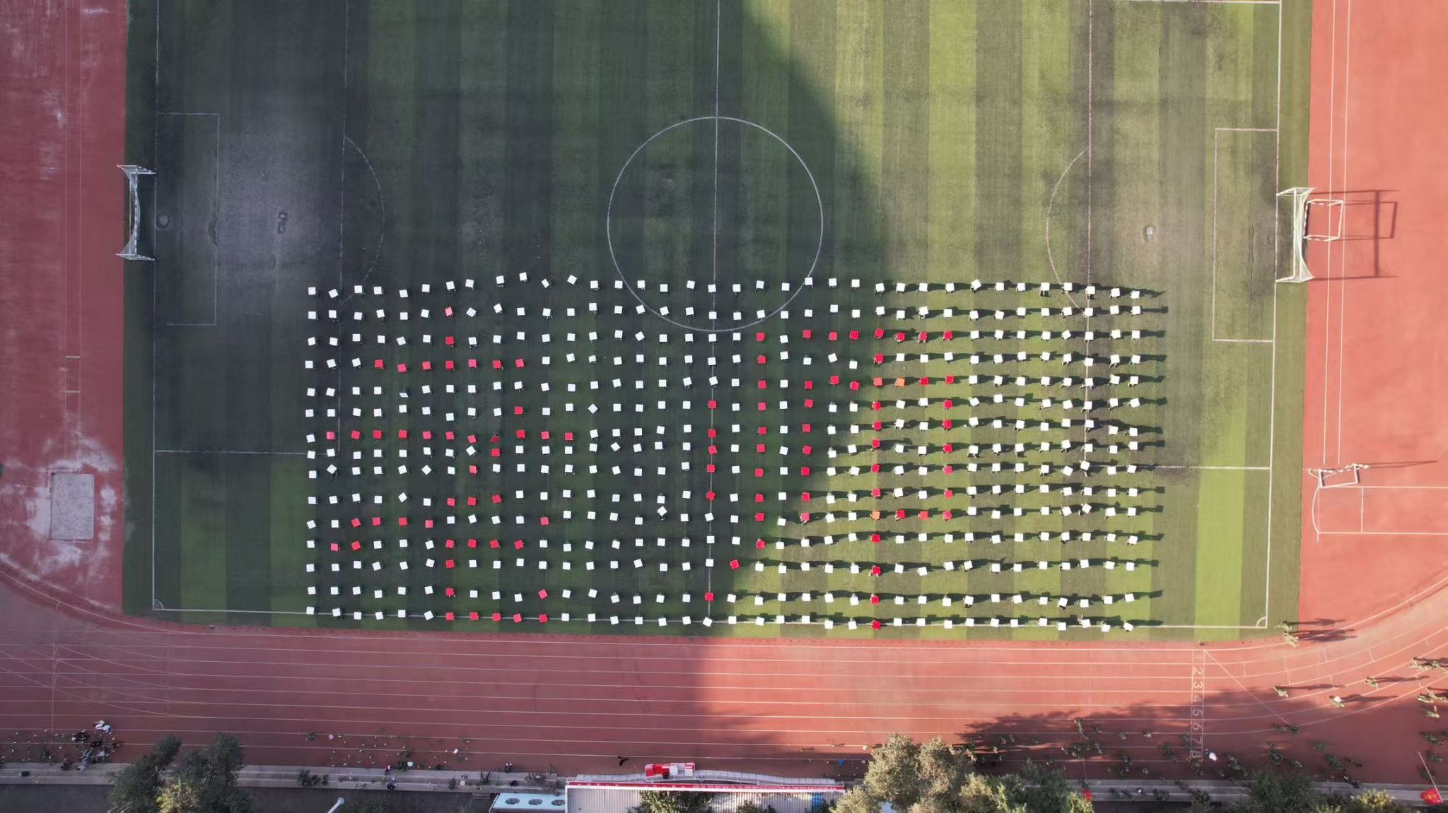 比賽尾聲,恰逢教師節前夕,全體新生手持“老師您辛苦了”“祝老師節日快樂” 等字樣的燈牌,在操場上整齊亮相,以溫暖的燈光與真摯的祝福,向教師表達敬意。