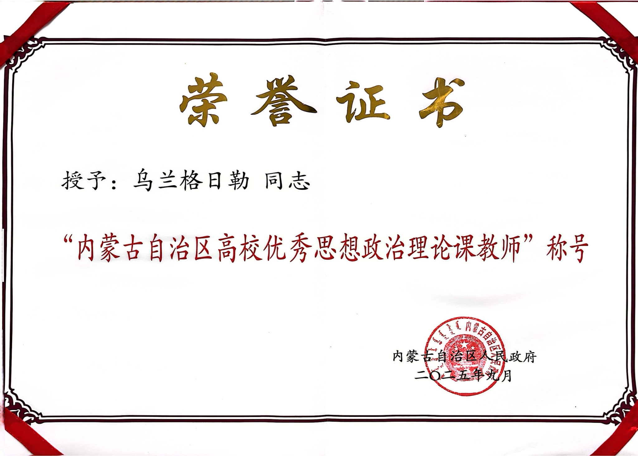 時逢第41個教師節,內蒙古自治區人民政府表彰了2025年全區教育系統先進集體和先進個人,我校馬克思主義學院烏蘭格日勒老師獲評“內蒙古自治區高校優秀思想政治理論課教師”榮譽稱號