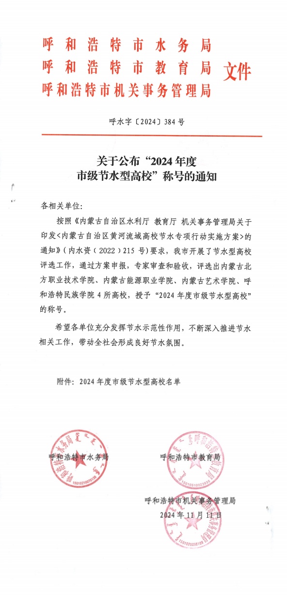 我校嚴格按照《內蒙古自治區黃河流域高校節水專項行動實施方案》(內水資〔2022〕215號)要求,全面啟動節水型高校申報工作。學校通過升級改造老舊供水管網、安裝智能水表實時監控等舉措,經過方案申報、專家審查和驗收等層層考核,憑借扎實的工作成效成功入選“2024年度市級節水型高校”名單。