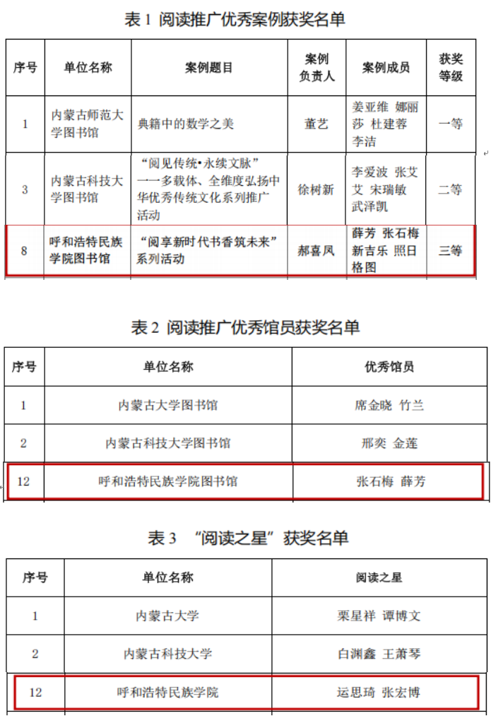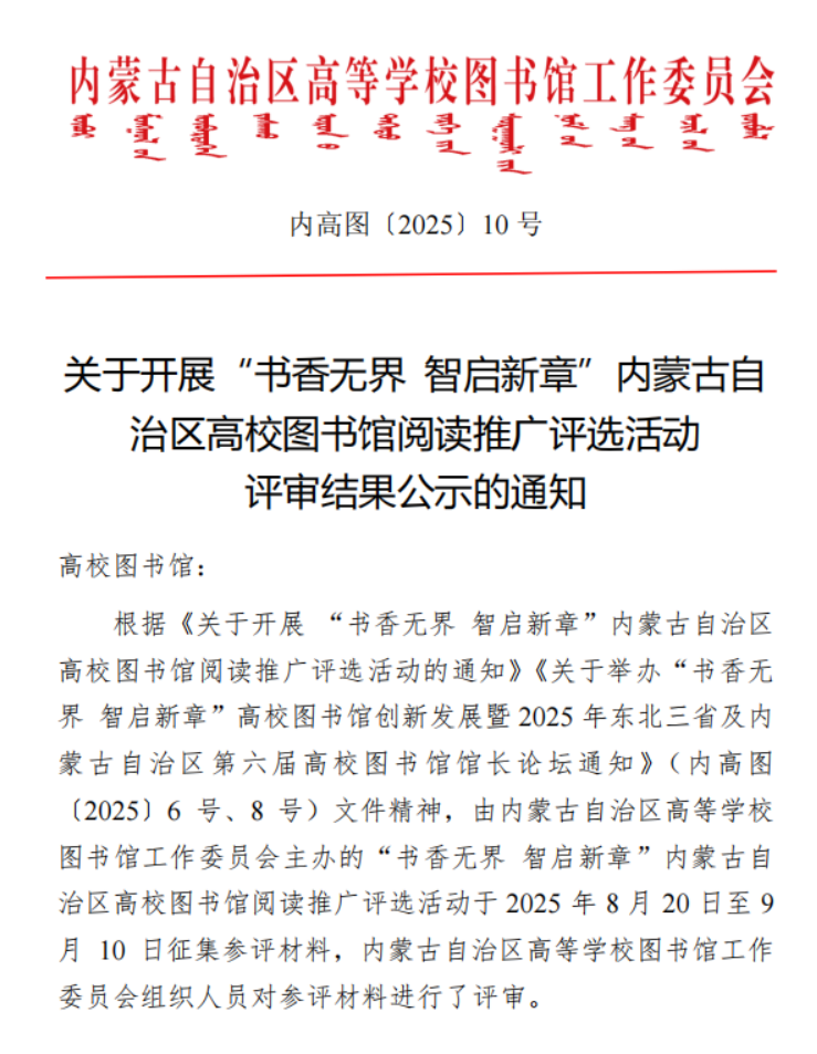 內蒙古自治區高校圖書館工作委員會于2025年8月-9月舉辦了“書香無界 智啟新章”內蒙古自治區高校圖書館閱讀推廣評選活動,旨在推動全區高校圖書館閱讀推廣工作的實踐創新。全區25所高校報送了資料,經專家評審、結果公示等環節,最終評選出閱讀推廣優秀案例一等獎2個、二等獎4個、三等獎6個,優秀獎13個;閱讀推廣優秀館員42名;“閱讀之星”40名。