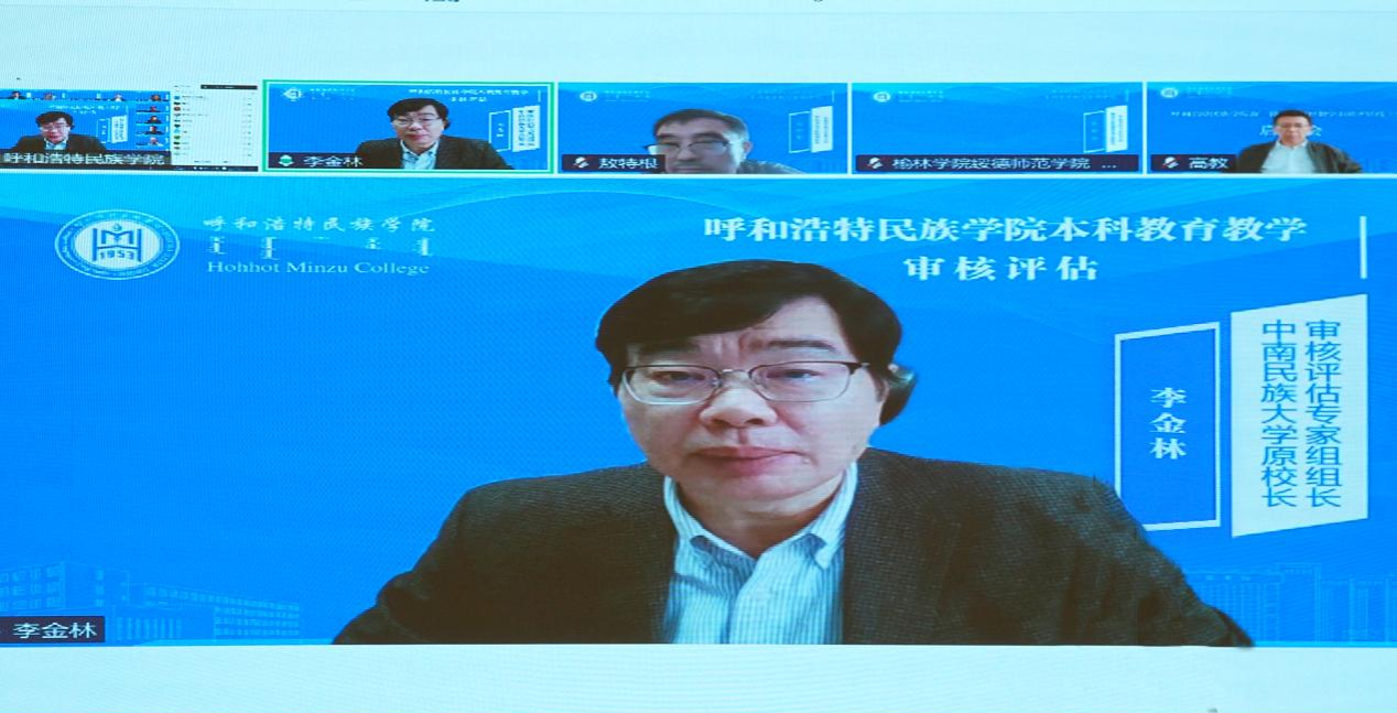 審核評估專家組組長、中南民族大學原校長李金林教授,專家組副組長、赤峰學院黨委副書記、校長季祥教授以及專家組全體成員,內蒙古自治區教育廳高教處處長席東民出席線上會議。校黨委書記劉九萬主持會議。校黨委副書記、校長王敏作本科教育教學審核評估工作匯報。校領導班子成員、副處級以上干部及師生代表參加會議。