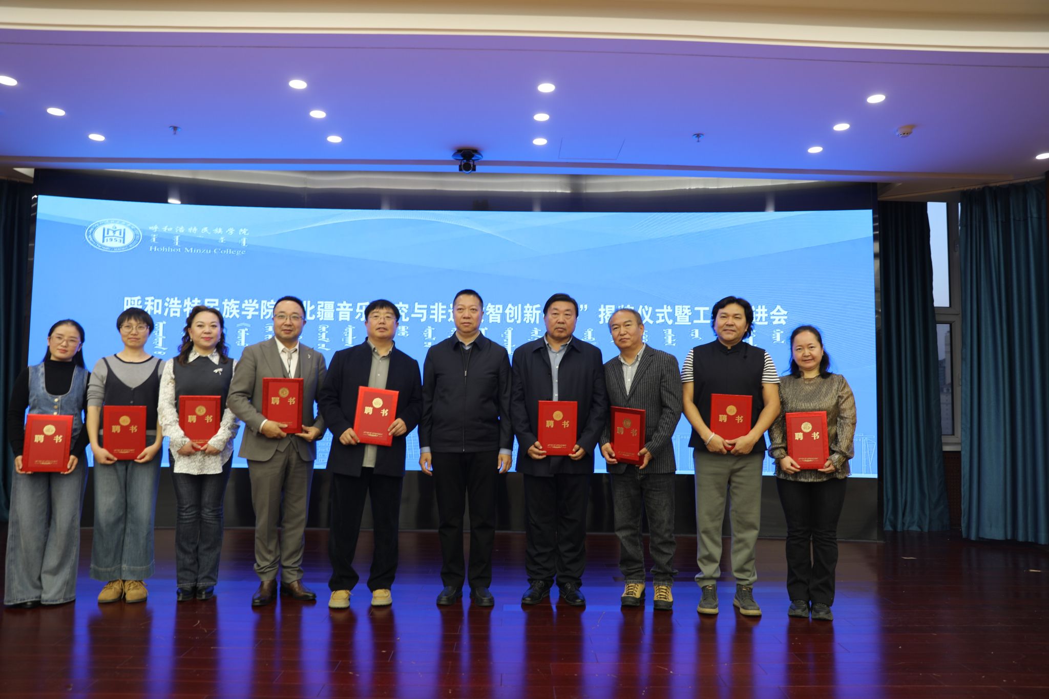 在舉行受聘儀式與贈(zèng)書儀式環(huán)節(jié),中心向受聘研究員、團(tuán)隊(duì)成員代表、科研助理代表頒發(fā)聘書。內(nèi)蒙古師范大學(xué)音樂學(xué)院呼格吉勒?qǐng)D教授、內(nèi)蒙古師范大學(xué)音樂學(xué)院松波爾教授、內(nèi)蒙古師范大學(xué)音樂學(xué)院副院長(zhǎng)賀宇教授、內(nèi)蒙古師范大學(xué)音樂學(xué)院副院長(zhǎng)雅茹副教授、內(nèi)蒙古藝術(shù)學(xué)院非遺學(xué)院院長(zhǎng)史永清教授、內(nèi)蒙古自治區(qū)文化和旅游發(fā)展研究院張勁盛評(píng)論員、通遼市藝術(shù)研究所國(guó)家一級(jí)評(píng)論員叁布拉諾日布教授等專家學(xué)者向中心贈(zèng)送了相關(guān)學(xué)術(shù)書籍。