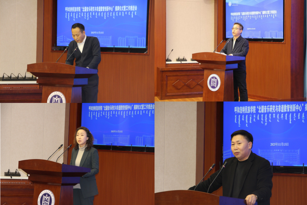 11月13日下午,我校“北疆音樂研究與非遺數(shù)智創(chuàng)新中心”揭牌儀式及工作推進(jìn)會(huì)在綜合樓12樓會(huì)議室舉行。校黨委委員、副校長(zhǎng)雙虎出席并講話,內(nèi)蒙古自治區(qū)人大教科文衛(wèi)委員會(huì)副主任委員吳海龍、內(nèi)蒙古師范大學(xué)音樂學(xué)院楊玉成教授、江西科技師范大學(xué)音樂學(xué)院哈斯巴特爾教授等區(qū)內(nèi)外專家學(xué)者以及中國(guó)音樂學(xué)院、內(nèi)蒙古師范大學(xué)、內(nèi)蒙古藝術(shù)學(xué)院,我校科研處、音樂與舞蹈學(xué)院相關(guān)負(fù)責(zé)人及師生代表參加。