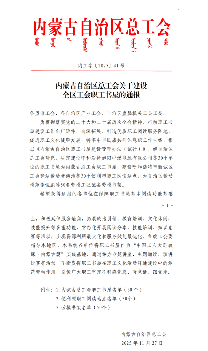 近日,內(nèi)蒙古自治區(qū)總工會印發(fā)《關(guān)于建設(shè)全區(qū)工會職工書屋的通報》(內(nèi)工字〔2025〕41號),我校成功入選“內(nèi)蒙古總工會職工書屋”建設(shè)單位,同時被納入“便利型職工閱讀站點”建設(shè)名單。