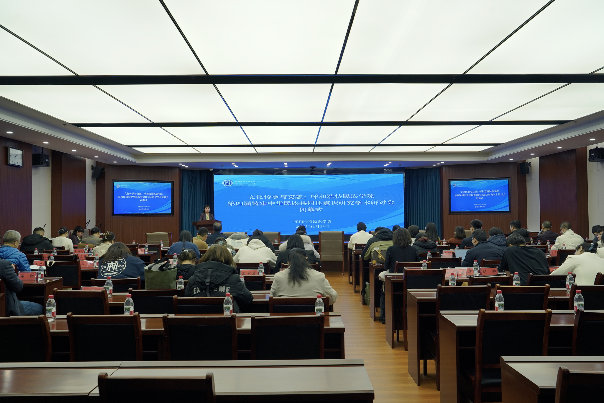11月29日,由學校鑄牢中華民族共同體意識研究基地、蒙古族非物質(zhì)文化遺產(chǎn)研究基地、北疆文化傳播實踐中心聯(lián)合舉辦的“文化傳承與交融:呼和浩特民族學院第四屆鑄牢中華民族共同體意識研究學術(shù)研討會”順利召開。來自民族團結(jié)雜志社、中國傳媒大學、云南大學、中央民族大學、北京外國語大學、青海大學、西北民族大學、西南民族大學、中南民族大學、青海民族大學、遼寧師范大學、塔里木理工大學以及區(qū)內(nèi)各高校、科研機構(gòu)的100余名專家學者齊聚一堂。內(nèi)蒙古自治區(qū)社會科學界聯(lián)合會黨組書記、主席烏恩奇,內(nèi)蒙古自治區(qū)社會科學院黨委委員、副院長烏云格日勒出席研討會并作主旨發(fā)言。內(nèi)蒙古自治區(qū)黨委宣傳部理論處處長布和、內(nèi)蒙古自治區(qū)民委理論研究處處長張玲玲等嘉賓應(yīng)邀出席。校黨委書記、鑄牢中華民族共同體意識研究基地主任劉九萬出席會議并致開幕辭。校黨委副書記格根哈斯主持開幕式。