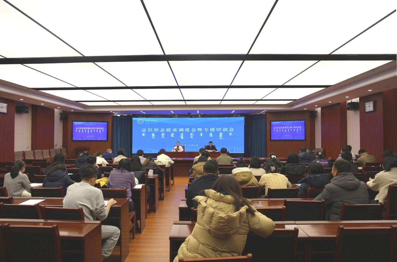 為深入學(xué)習(xí)貫徹落實(shí)習(xí)近平總書記關(guān)于意識(shí)形態(tài)工作和網(wǎng)絡(luò)強(qiáng)國的重要論述,進(jìn)一步加強(qiáng)思想政治工作隊(duì)伍建設(shè),12月3日,學(xué)校舉辦意識(shí)形態(tài)聯(lián)席調(diào)度會(huì)暨專題培訓(xùn)會(huì),邀請意識(shí)形態(tài)領(lǐng)域?qū)<易鲗n}培訓(xùn)。校黨委委員、宣傳部部長張海峰主持會(huì)議。各學(xué)院黨總支副書記及輔導(dǎo)員、宣傳員、班主任代表和宣傳部全體人員參加會(huì)議。